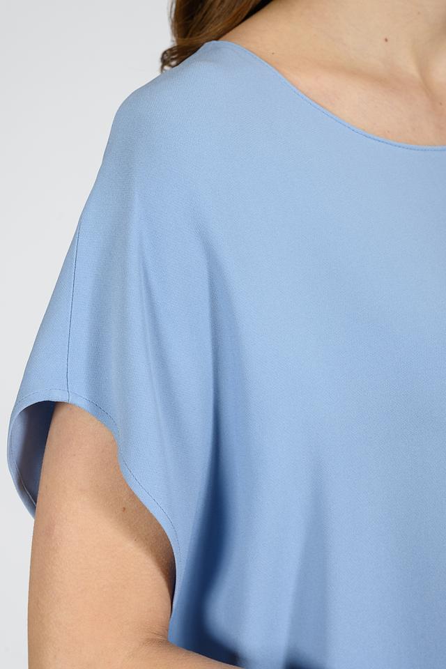 Платье имеет прямой, слегка трапециевидный силуэт, который подходит для разных типов фигур. Вырез горловины – округлый, а рукава – короткие, широкие, типа «крыло». Отсутствие каких-либо декоративных элементов делает этот наряд лаконичным и универсальным.