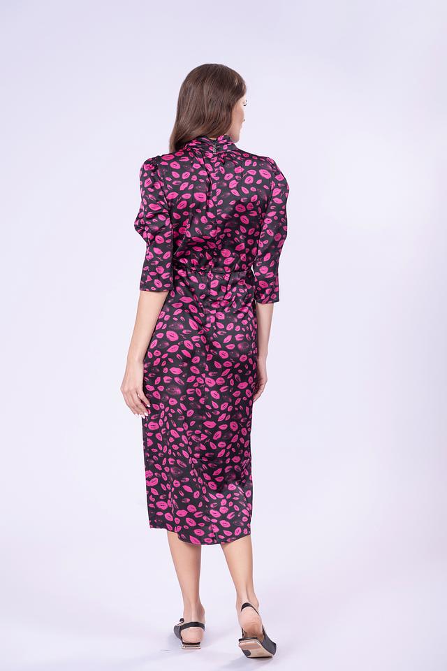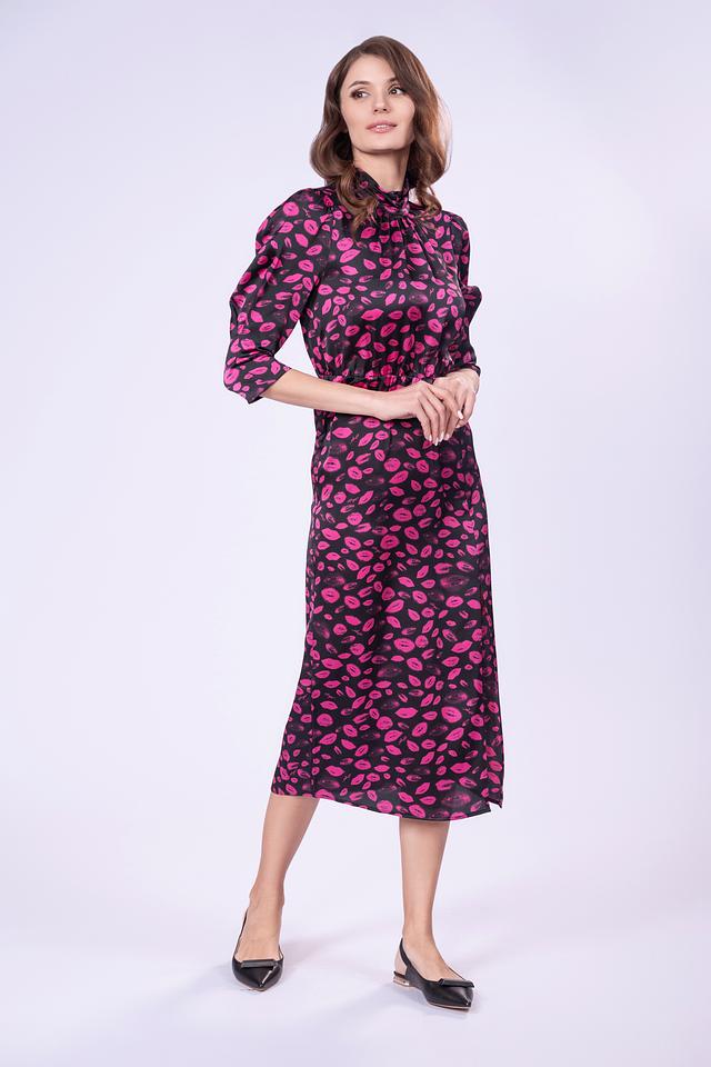 Основной цвет платья – чёрный, который служит идеальным фоном для яркого розового принта в виде губ. Такой рисунок добавляет образу игривости и кокетства. Платье имеет длину миди, что делает его универсальным для различных случаев.