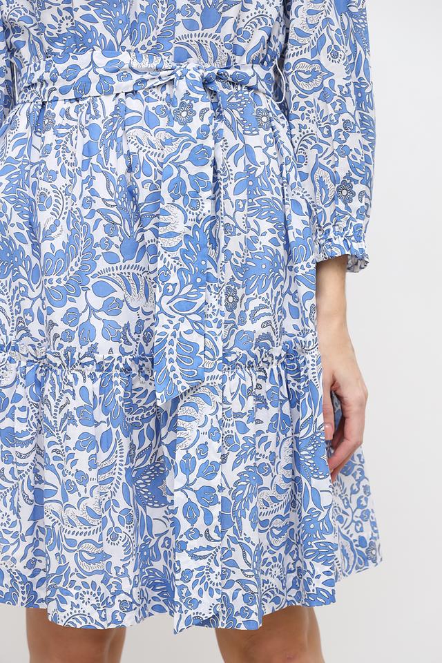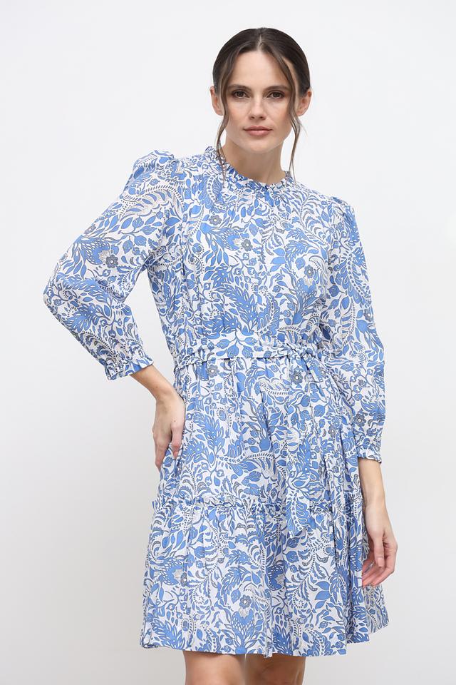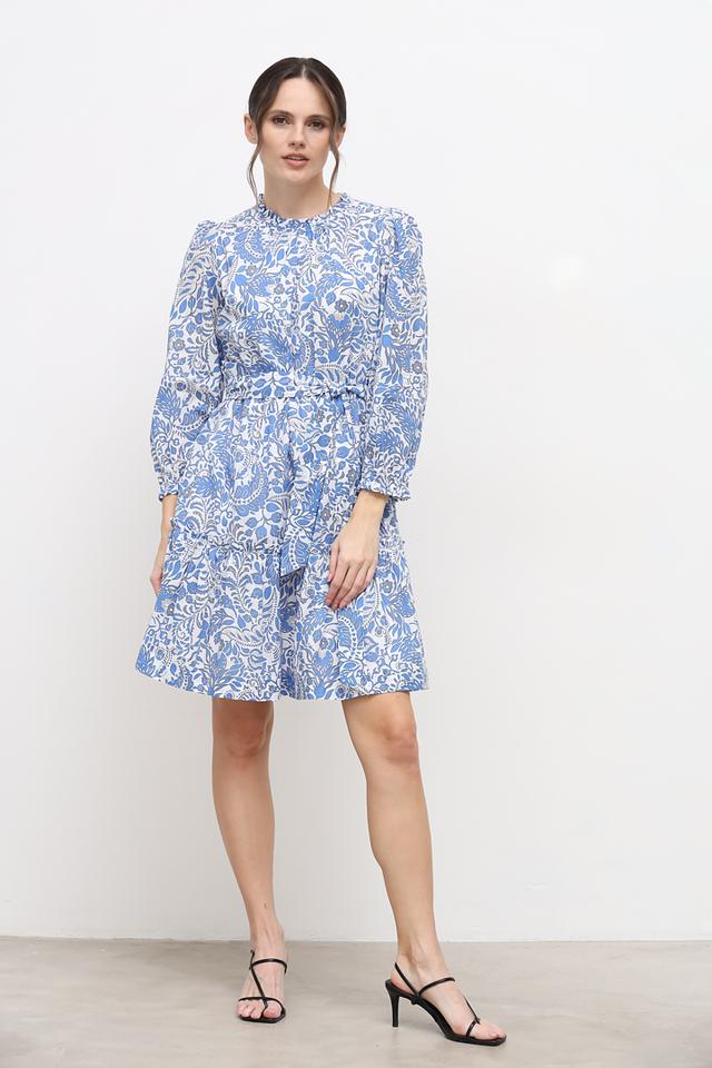 Дизайн платья представлен в виде изысканного цветочного принта, сочетающего в себе различные оттенки голубого и белого цветов. Силуэт платья приталенный, с акцентом на талии благодаря поясу. Рукава длиной 3/4 добавляют образу женственности и лёгкости.