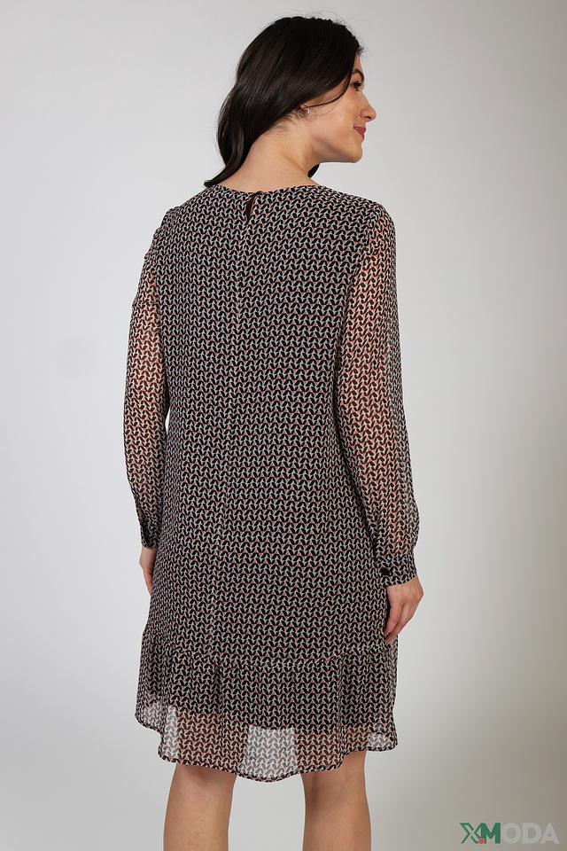 Платье имеет длину до колена и свободный крой, который не сковывает движения. Длинные рукава и V-образный вырез придают образу женственность. Присборенная юбка добавляет платью объема и легкости.