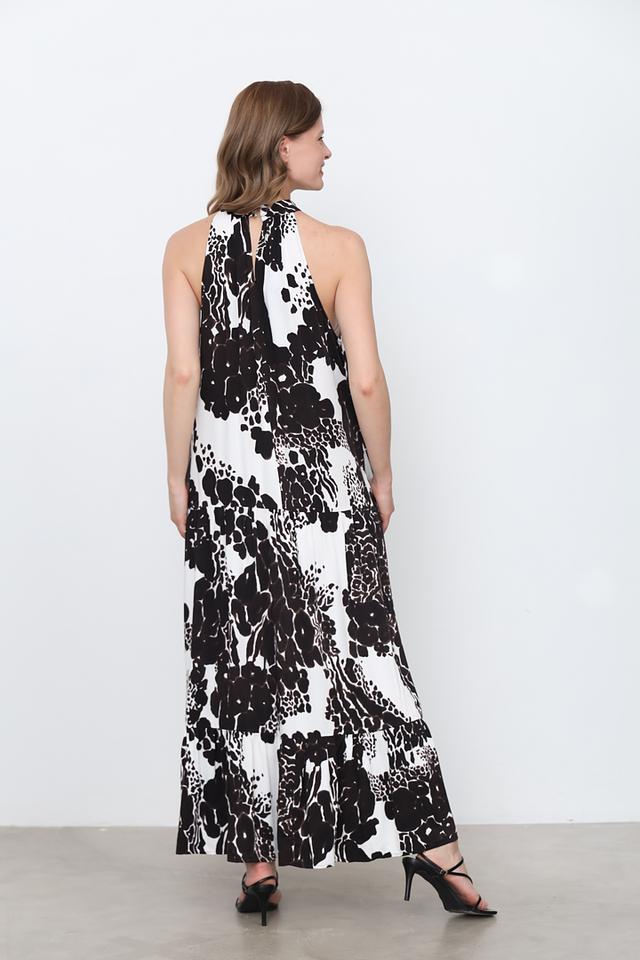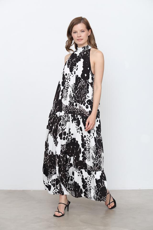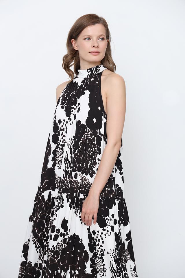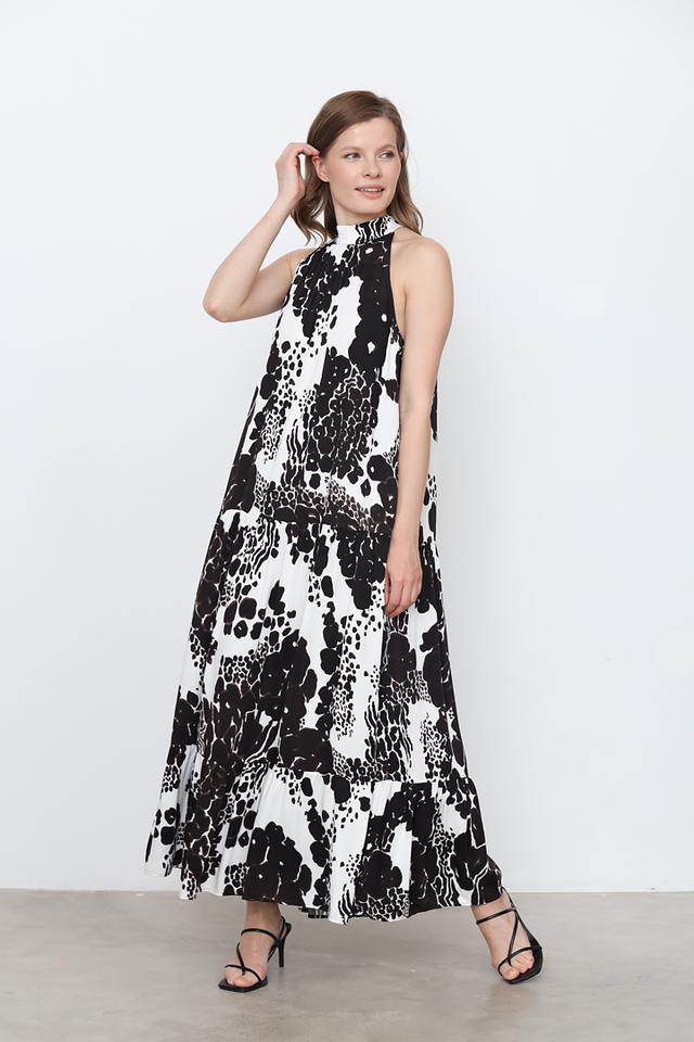 Модель имеет длину макси, свободный крой и регулируемые бретели, что обеспечивает комфортную посадку по фигуре. Высокий воротник-хомут добавляет изысканности образу. Платье идеально подходит для создания как повседневных, так и вечерних образов.