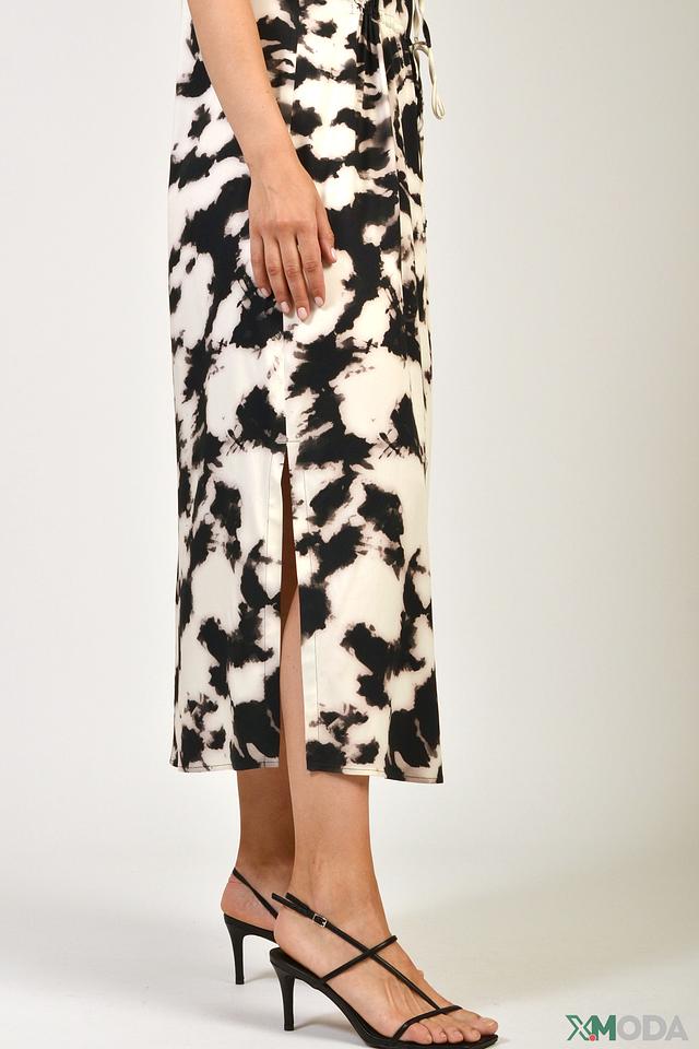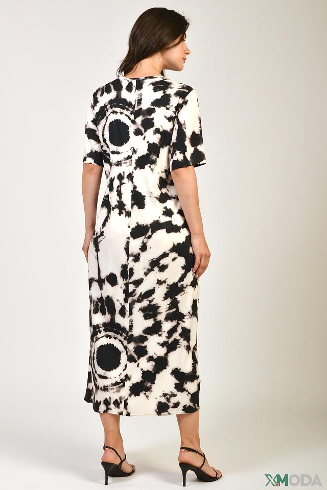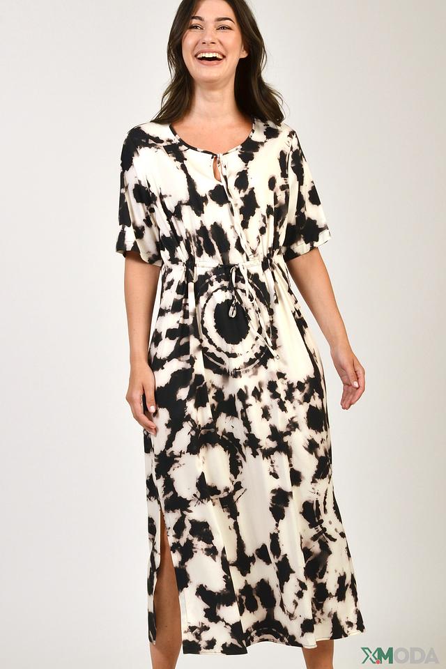 Основной цвет платья – белый, но оно украшено эффектным принтом в технике тай-дай, выполненным в чёрных тонах. Такой рисунок делает платье уникальным и привлекает внимание. V-образный вырез горловины и короткие рукава придают платью лёгкость и воздушность.