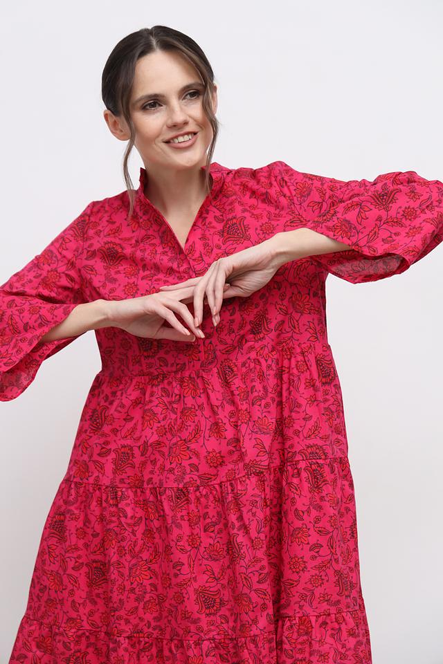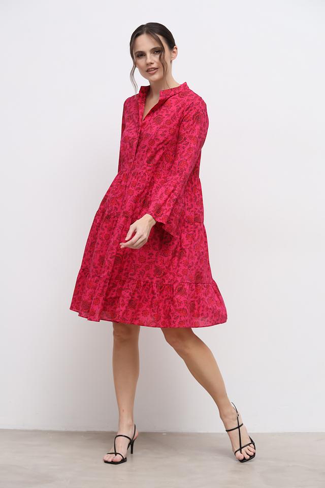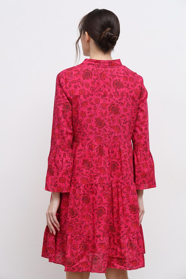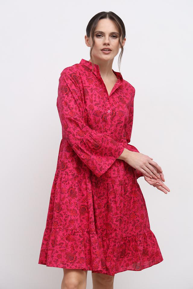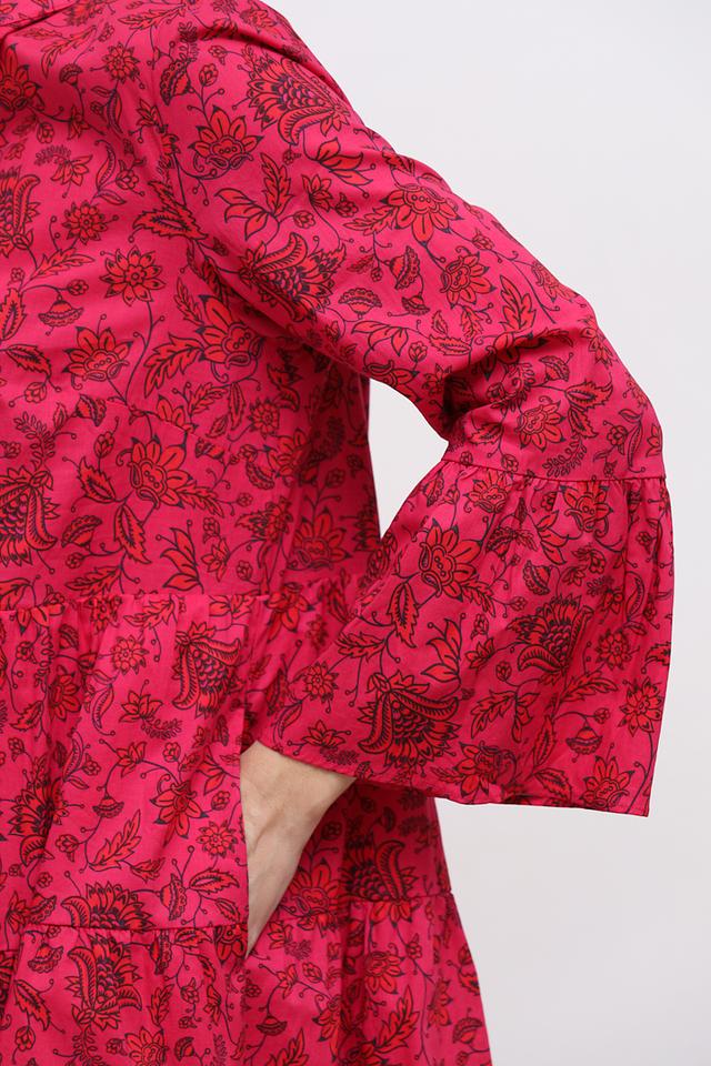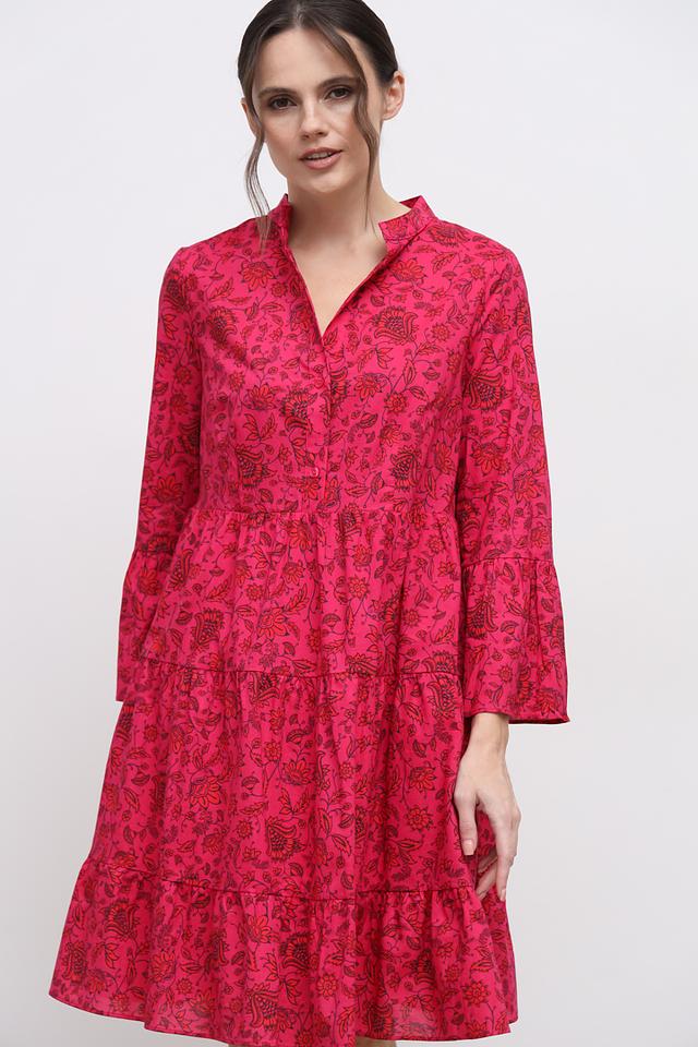 Платье Apart ярко-розового цвета с цветочным принтом – стильное и комфортное решение для повседневного образа. Модель выполнена из 100% хлопка, имеет рубашечный крой и многоярусную юбку. Состав: хлопок 100%