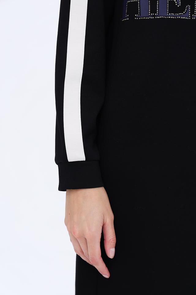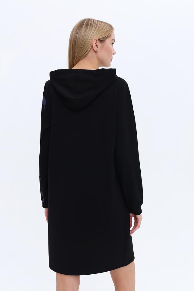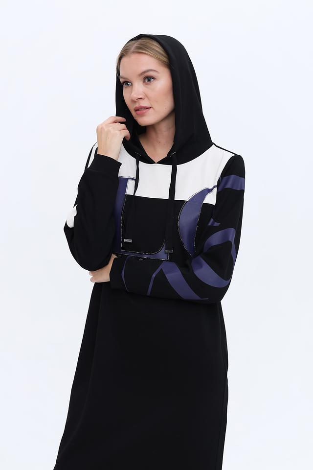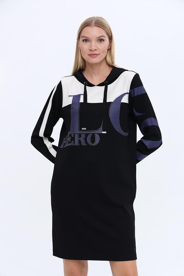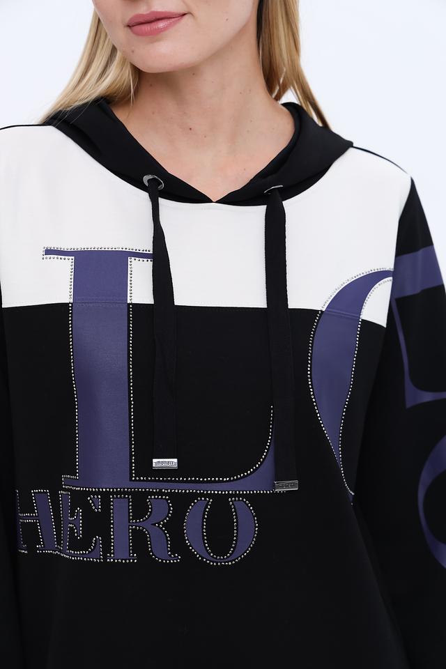 Чёрное платье от Monari с капюшоном и ярким логотипом "HERO" — стильный выбор для повседневного образа. Удобный крой и мягкий трикотаж обеспечивают комфорт в течение дня. Состав: полиэстер 55%, вискоза 38%, эластан 7%