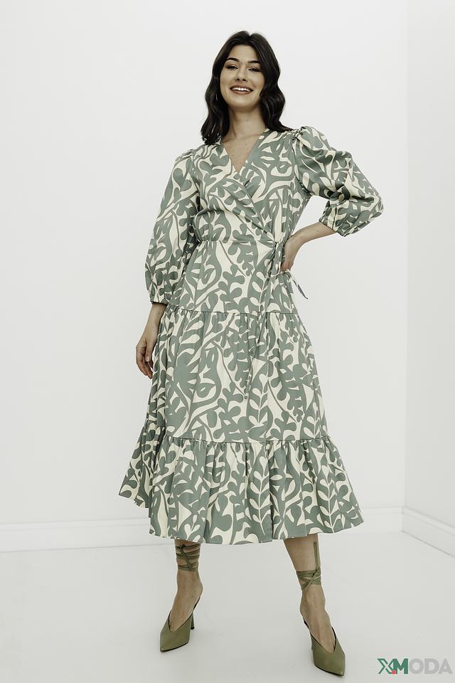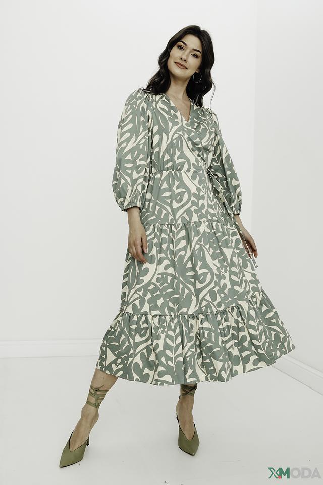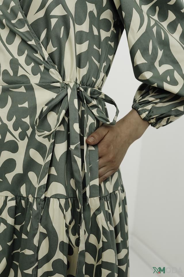 Модель имеет V-образный вырез и завязывается на талии, создавая женственный силуэт. Рукава 3/4 и юбка-солнце добавляют образу легкости и воздушности. Платье украшено оригинальным растительным принтом в нежных оттенках зеленого и бежевого.