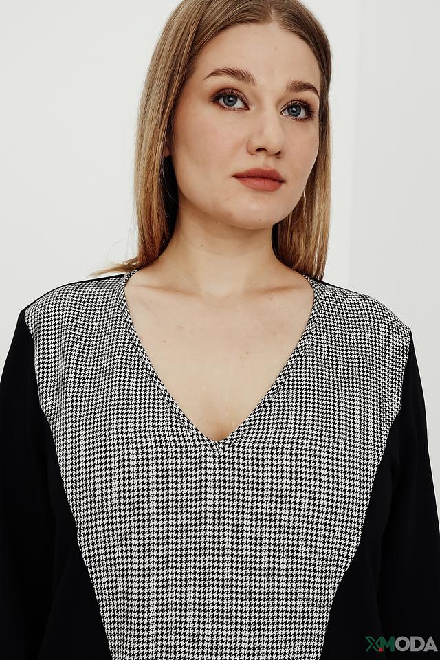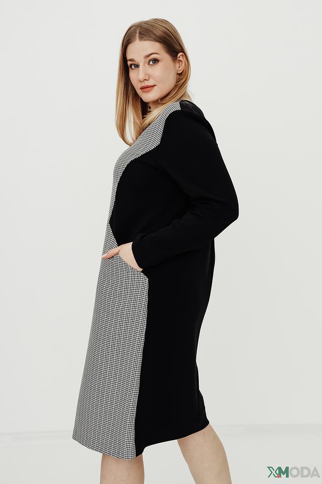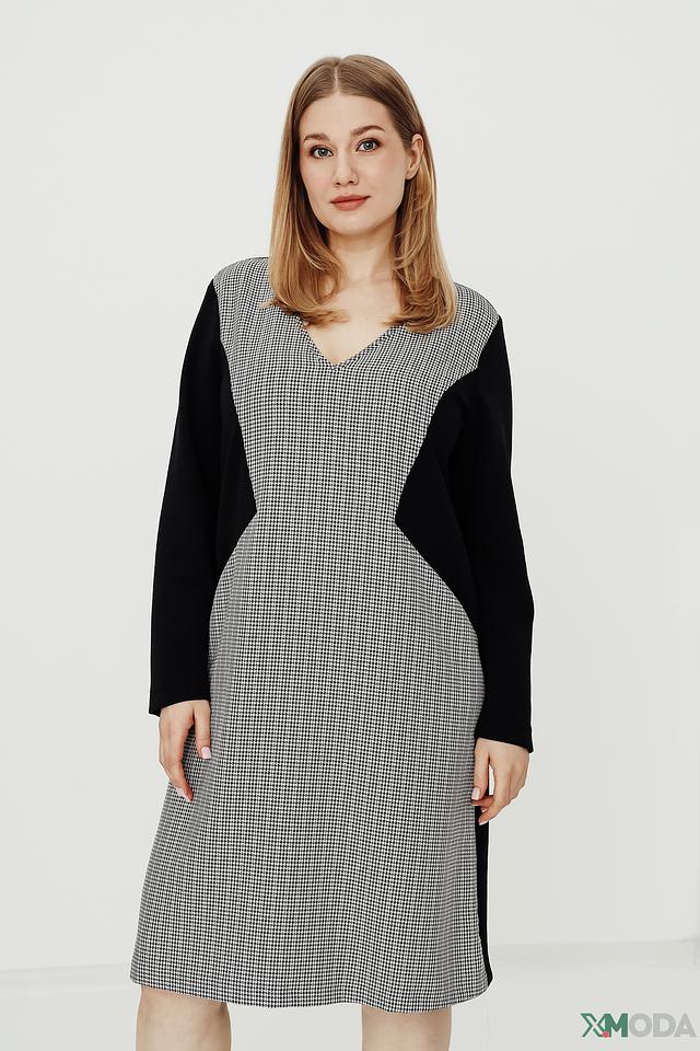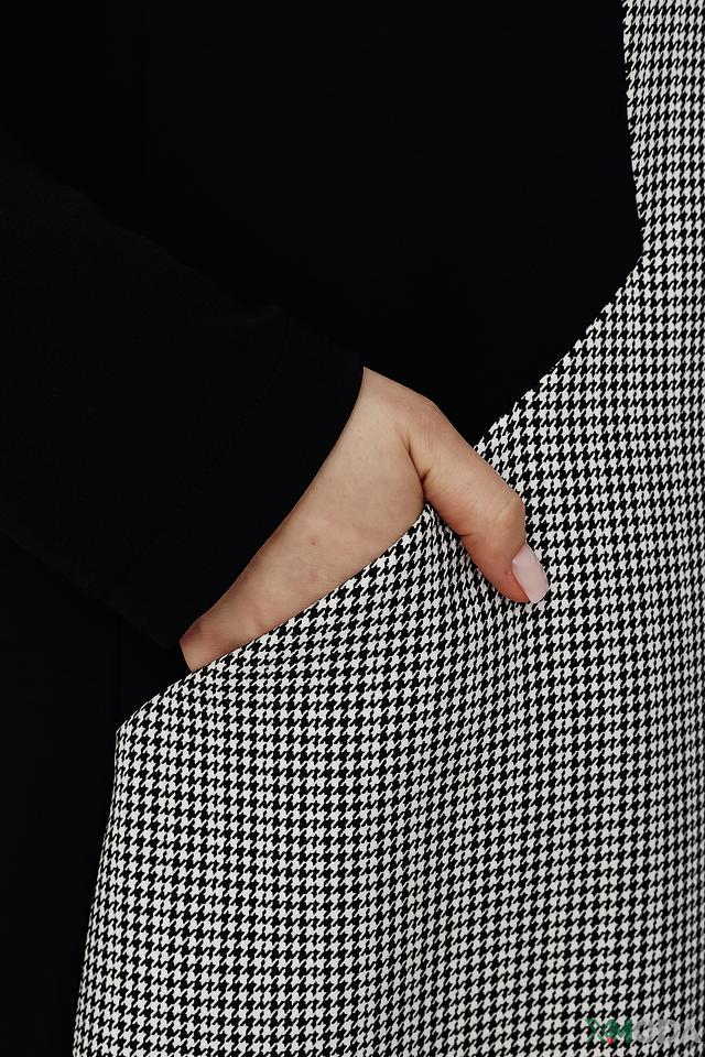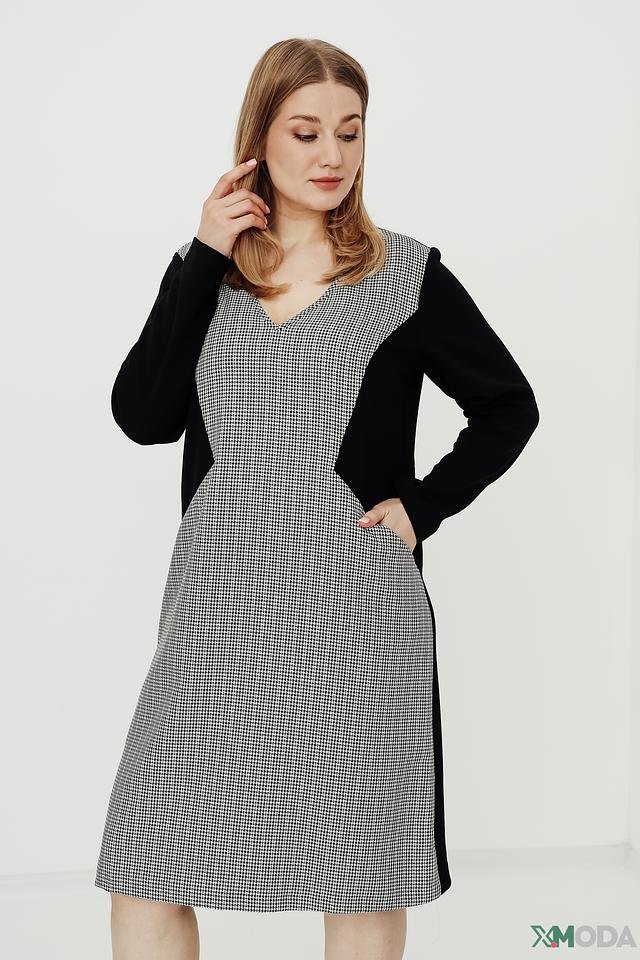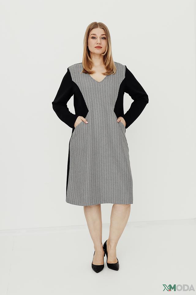 Платье выполнено в черно-белой цветовой гамме, с клетчатым принтом на основной части и черными рукавами и вставками по бокам. V-образный вырез горловины и длина миди придают образу элегантность.