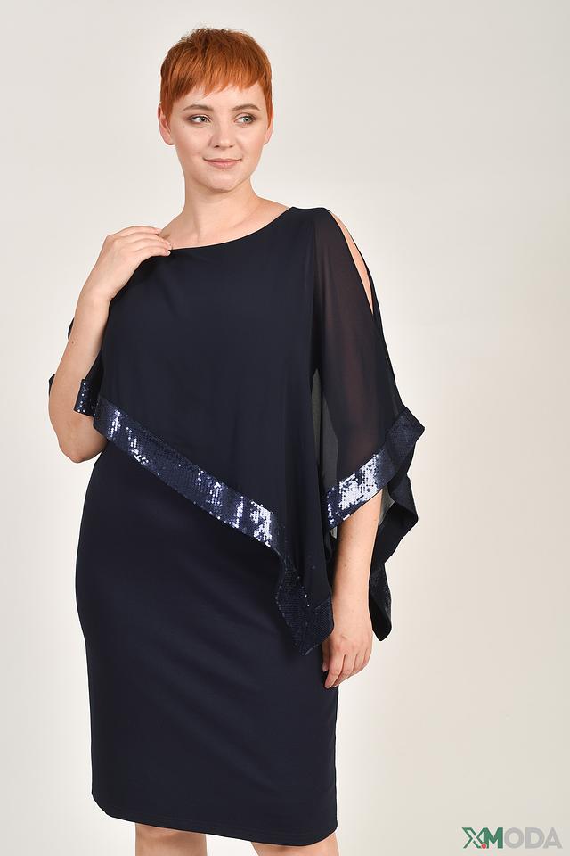 Особенностью платья являются рукава-воланы, выполненные из полупрозрачной ткани и декорированные мерцающими пайетками. Этот элемент придает образу нарядность и оригинальность. Вырез горловины округлый, что обеспечивает комфортную посадку.