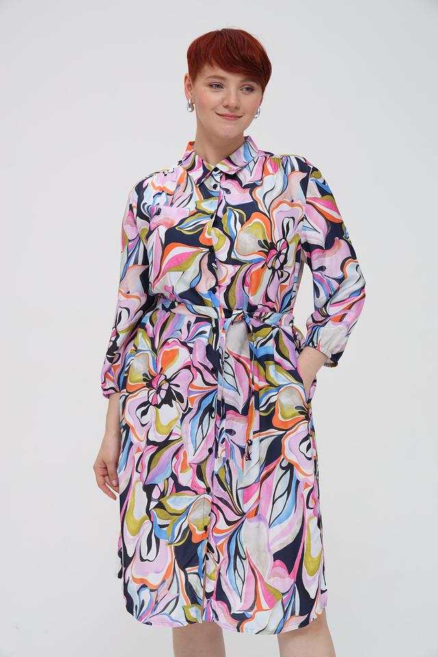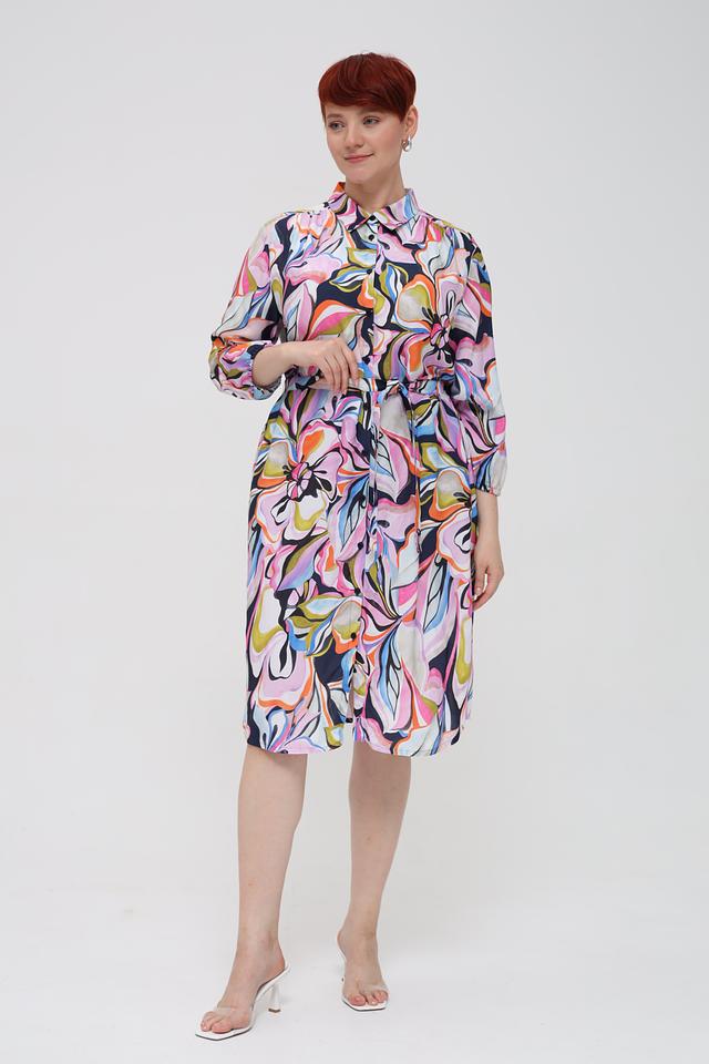 Платье имеет приталенный силуэт, который подчеркивает фигуру. Застежка на пуговицах и пояс позволяют регулировать посадку по фигуре. Рукава 3/4 делают платье универсальным для различных случаев.