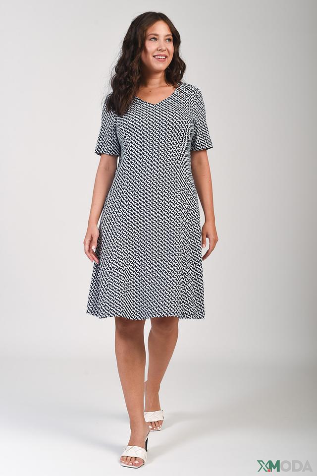 Платье имеет прямой силуэт, длину до колена и V-образный вырез горловины. Короткие рукава слегка расклешены к низу. Основной цвет платья – белый, украшен мелким синим геометрическим рисунком, который придает ему свежий и стильный вид.