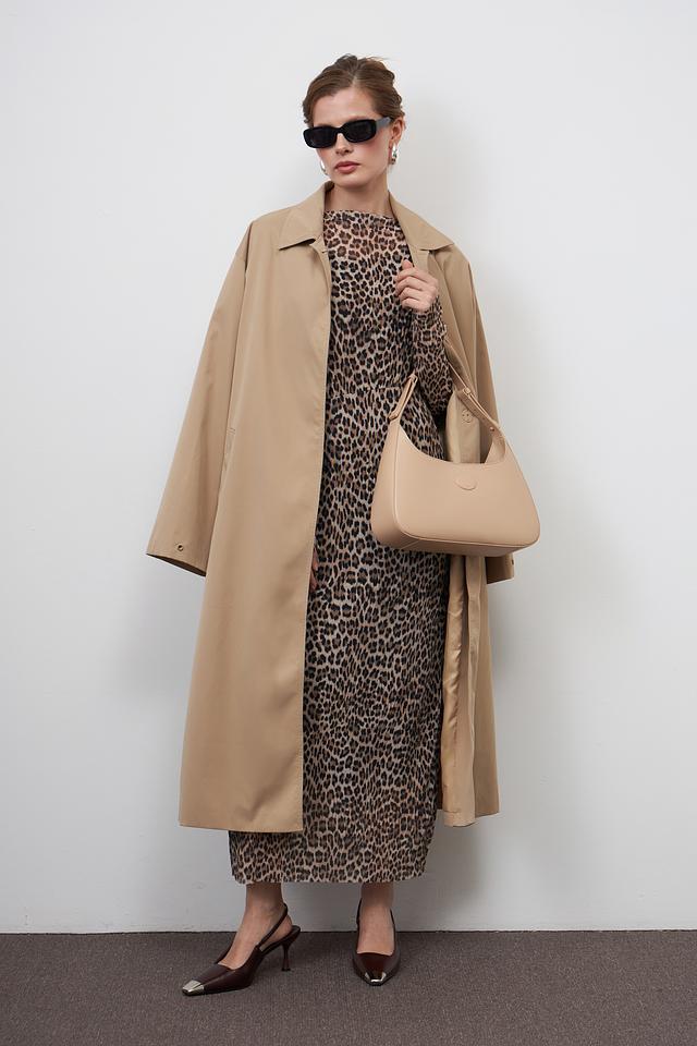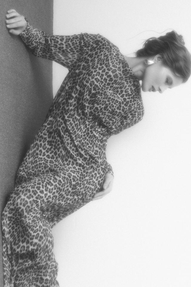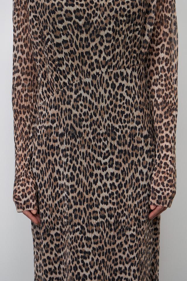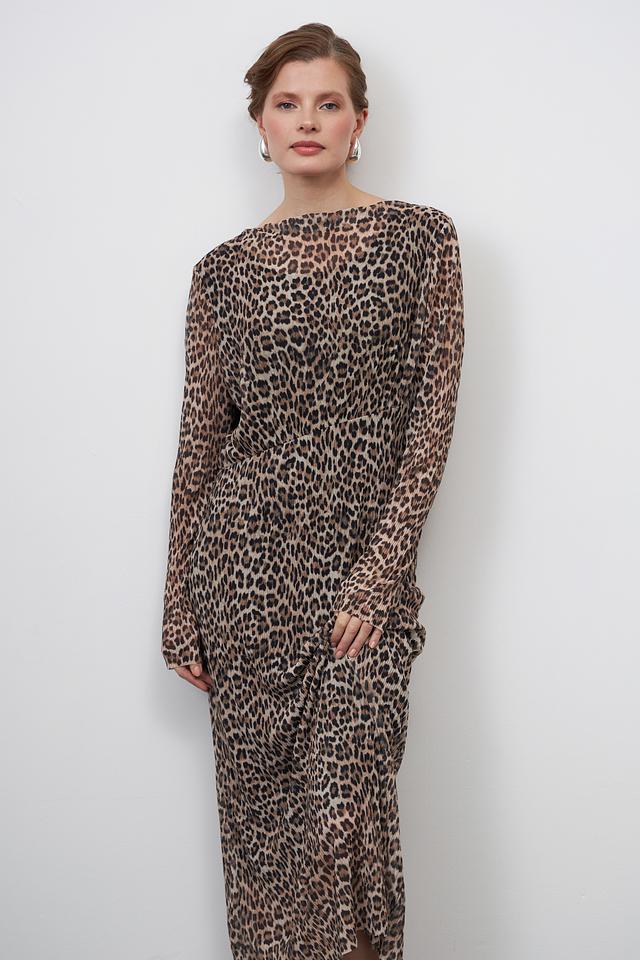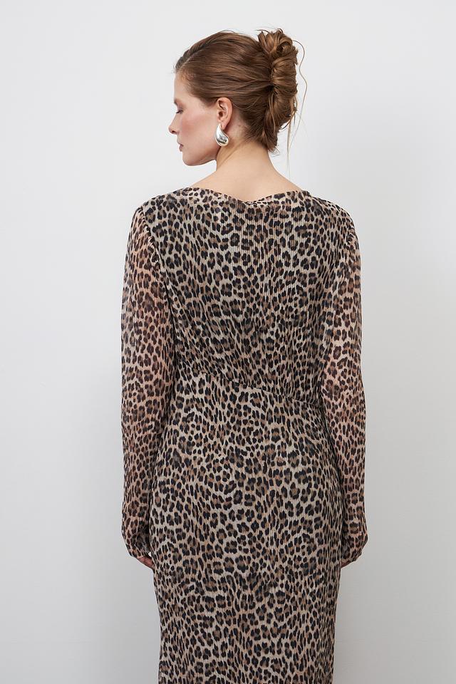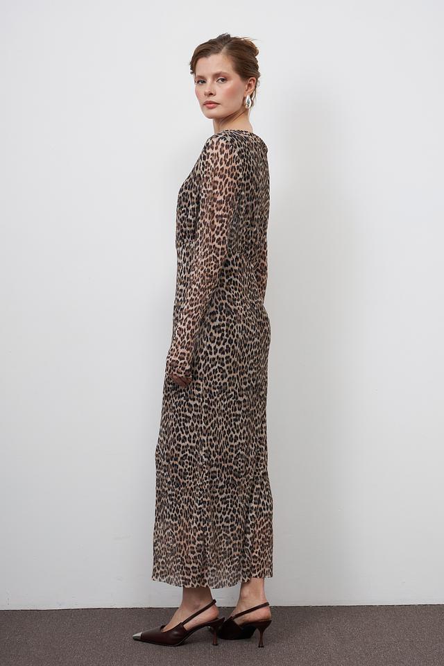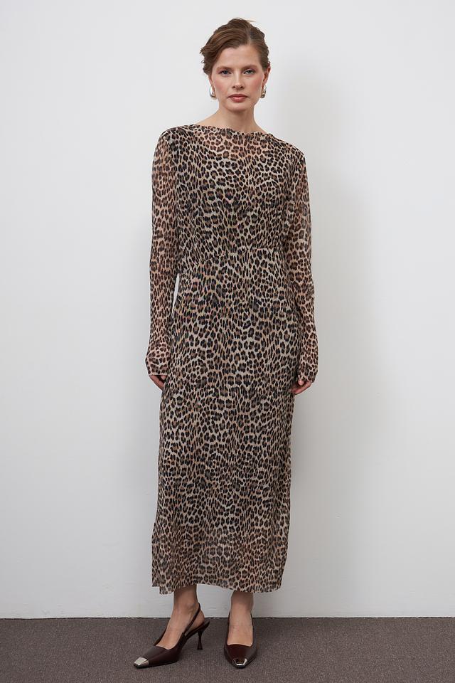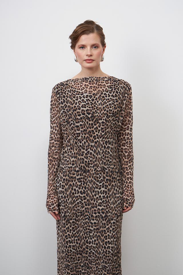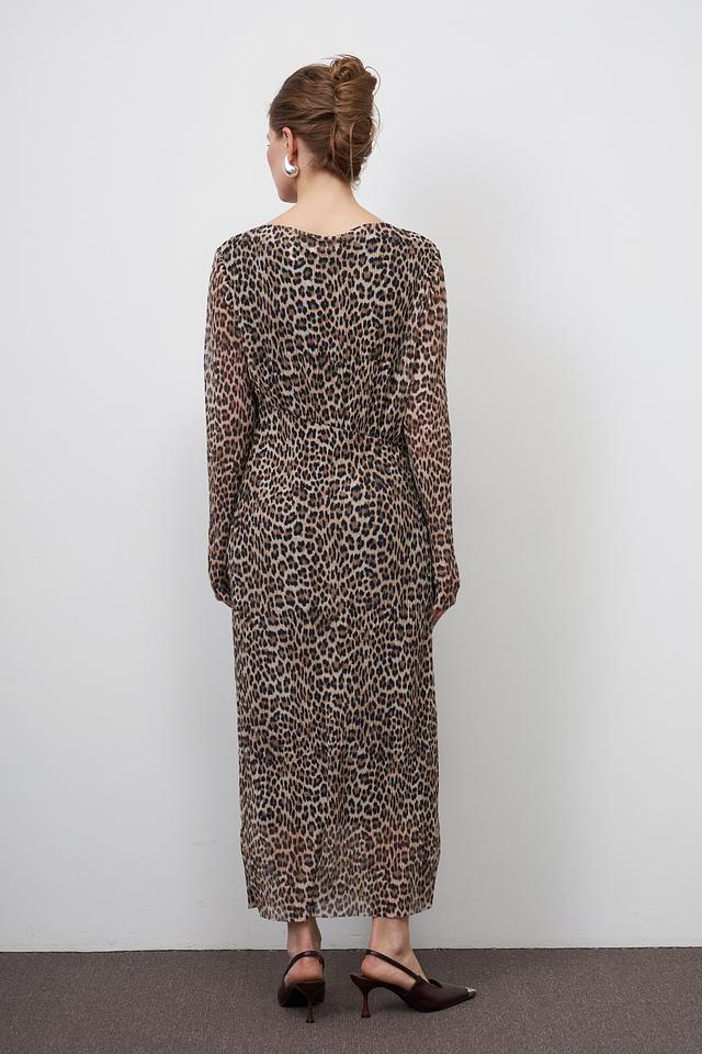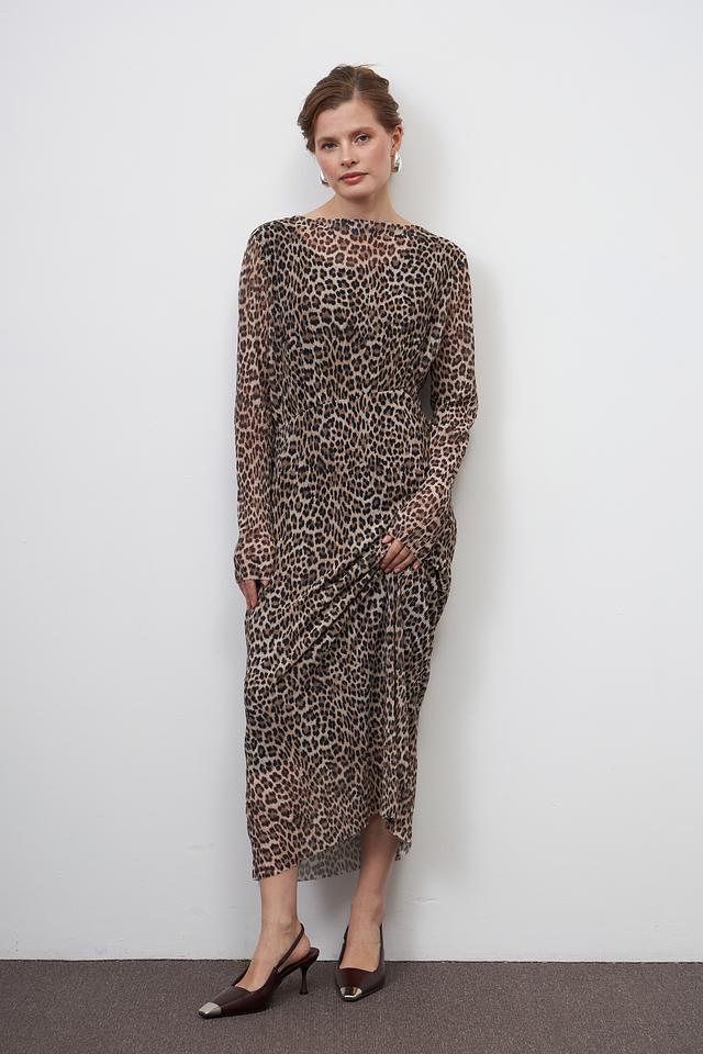 Платье выполнено из полиэстера с добавлением эластана, что обеспечивает комфорт и хорошую посадку по фигуре. Леопардовый принт делает это платье ярким и запоминающимся элементом гардероба.