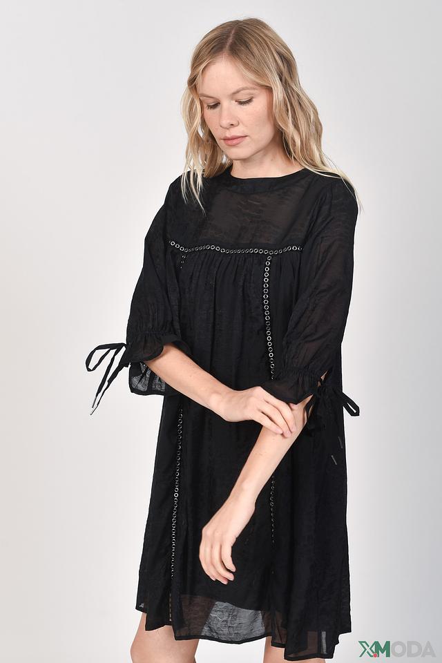 Платье имеет прямой силуэт, длину до колена и ¾ рукава с небольшими сборками и завязками на манжетах. Вырез горловины округлый, декорирован изящной вышивкой, придающей образу женственность и утончённость.