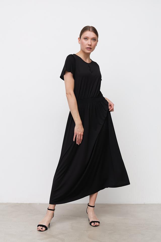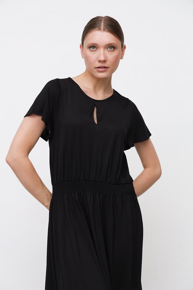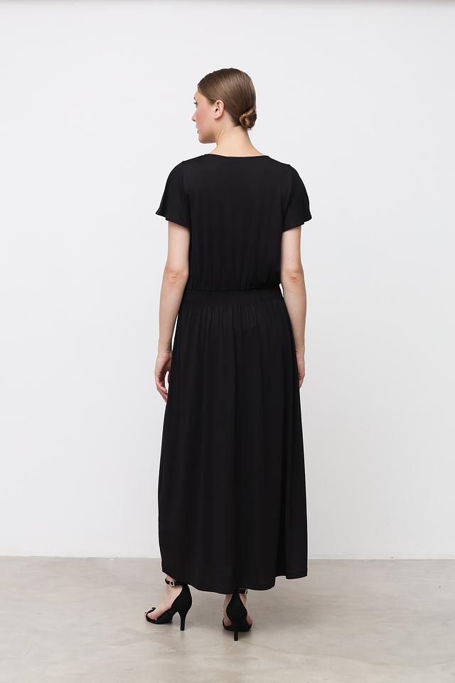 Модель имеет прямой крой, короткие рукава и длину миди. Завышенная талия на эластичной резинке обеспечивает комфортную посадку и подчеркивает фигуру. Небольшой вырез на горловине добавляет образу изысканности.