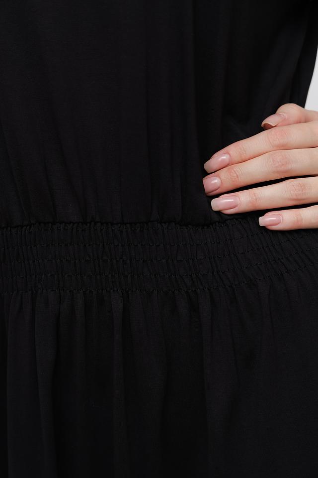 Чёрное платье от Taifun – это элегантность и комфорт в одном изделии. Модель выполнена из мягкой ткани с добавлением модала, имеет удобную завышенную талию на резинке и небольшой вырез на горловине. Состав: модал 65%, полиэстер 35%