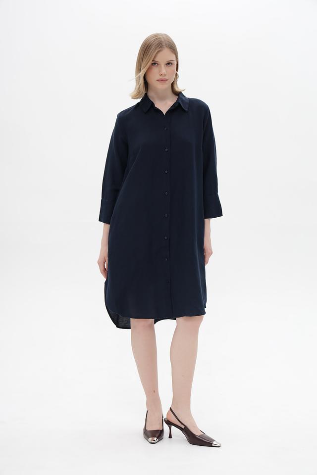 Модель имеет прямой крой, воротник рубашечного типа и застёжку на пуговицы по всей длине. Рукава длиной три четверти делают платье универсальным для любой погоды. Асимметричный подол добавляет образу динамичности и оригинальности.