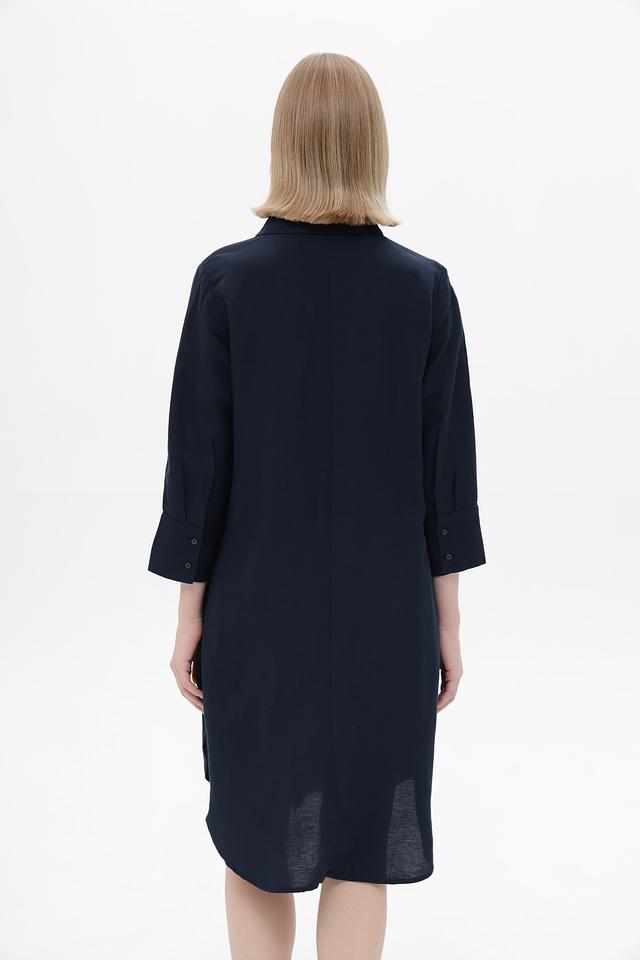 Тёмно-синее платье-рубашка от Tom Tailor выполнено из льна и вискозы. Удобный крой и натуральный состав обеспечивают комфорт в жаркую погоду. Состав: лен 55%, вискоза 45%
