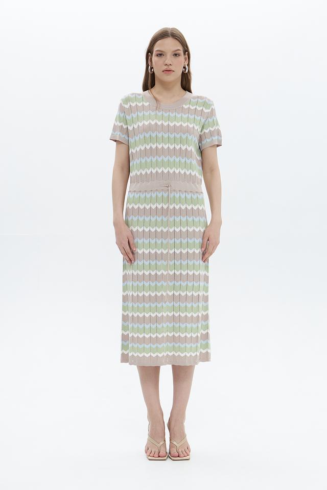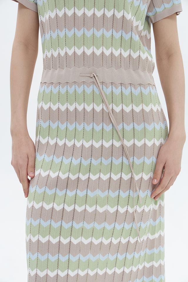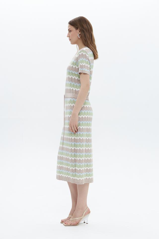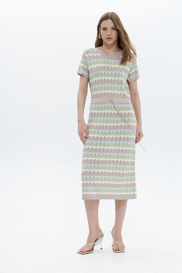 Особенностью модели является оригинальный узор в полоску, выполненный в нежных пастельных тонах: бежевом, светло-зелёном и светло-лиловом. Платье имеет прямой силуэт, короткие рукава и длину миди.