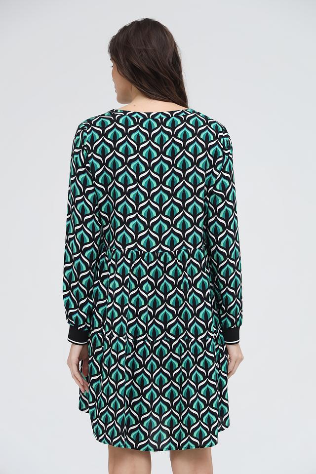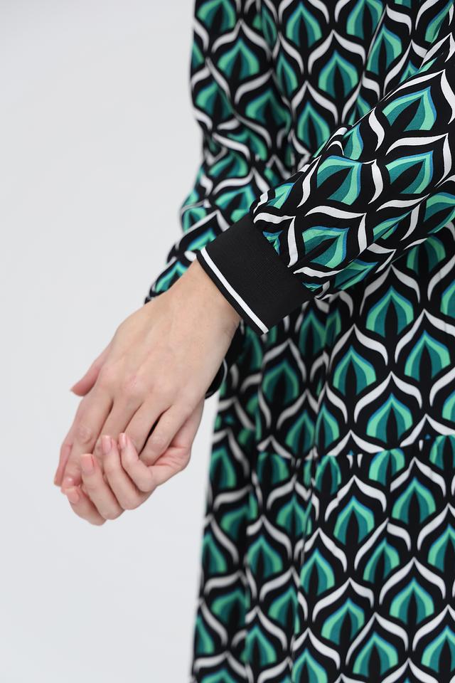 Платье имеет прямой силуэт, длинные рукава и V-образный вырез горловины. Особенностью модели является яркий геометрический принт в бирюзовых, белых и черных тонах, который придает образу оригинальность и динамичность.