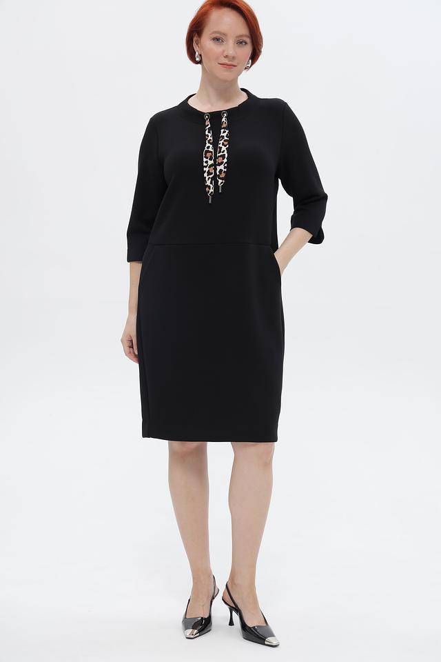 Особенность модели – оригинальный декор в виде вертикальной вставки с леопардовым принтом и декоративными шнурками. Платье имеет рукава длиной три четверти и круглый вырез горловины.