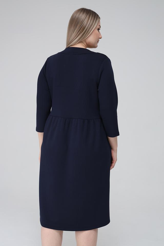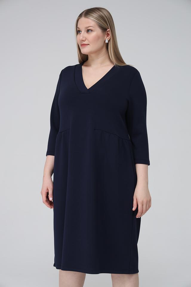 Платье имеет прямой силуэт, V-образный вырез горловины и рукава длиной 3/4. На талии предусмотрена небольшая сборка, которая создает легкий акцент и подчеркивает фигуру. Боковые швы дополнены функциональными карманами.