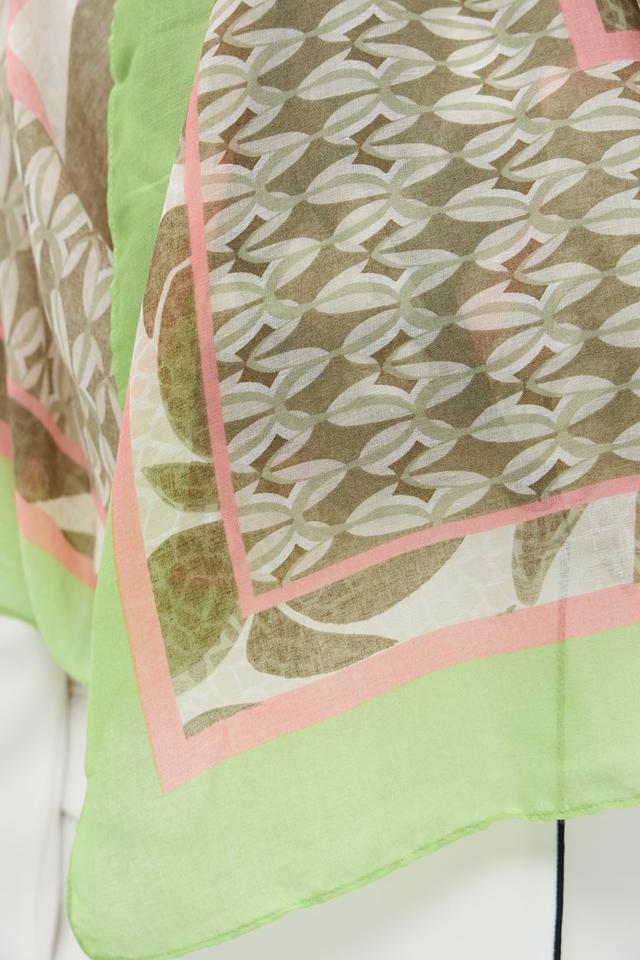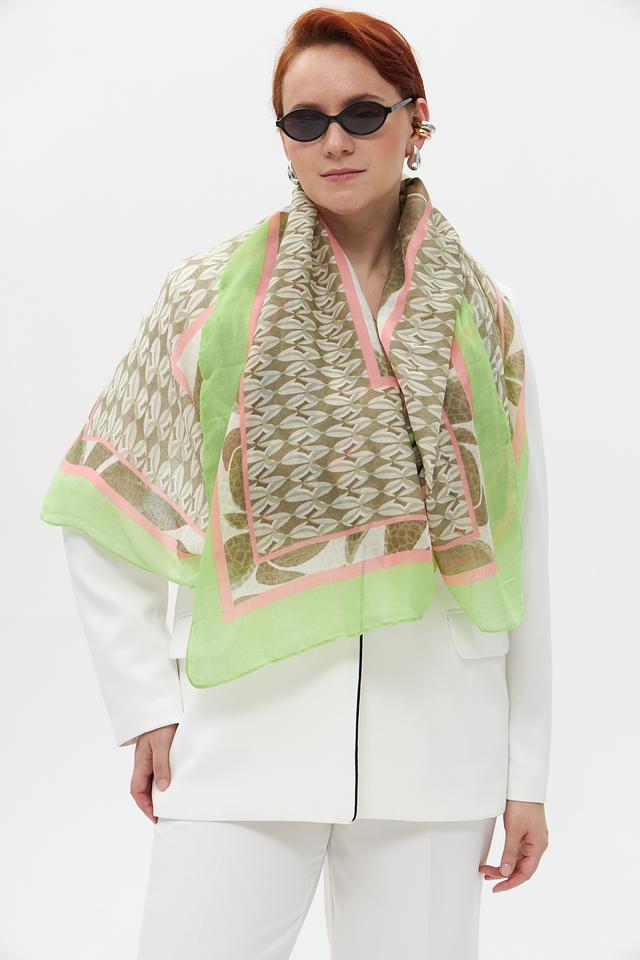 Платок имеет лёгкую, воздушную текстуру и украшен ярким цветочным принтом в зелёных, коричневых и розовых тонах. Такой рисунок добавит свежести и оригинальности вашему образу.