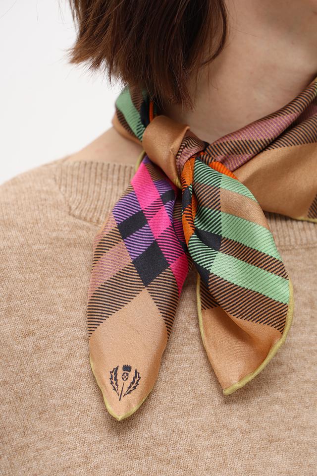 Платок имеет квадратную форму и украшен ярким клетчатым принтом, сочетающим в себе оттенки зеленого, оранжевого, розового и черного на бежевом фоне. Такой рисунок добавит изюминку и индивидуальность вашему стилю.