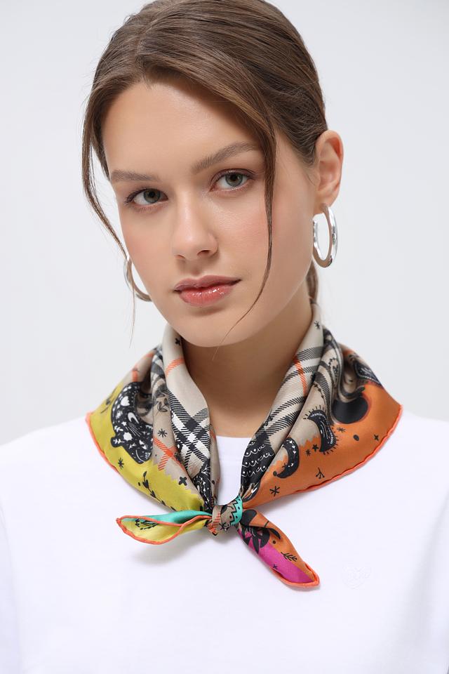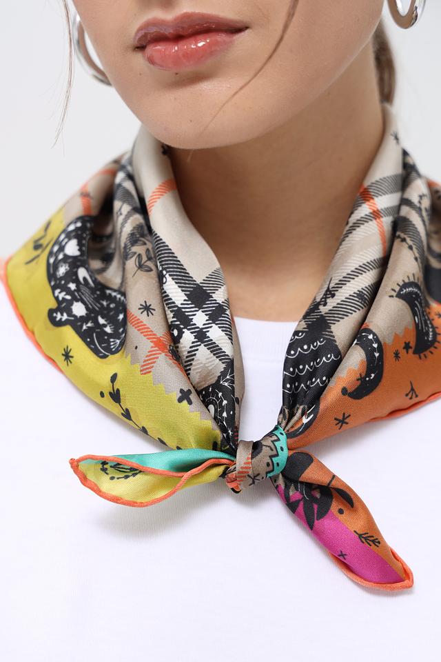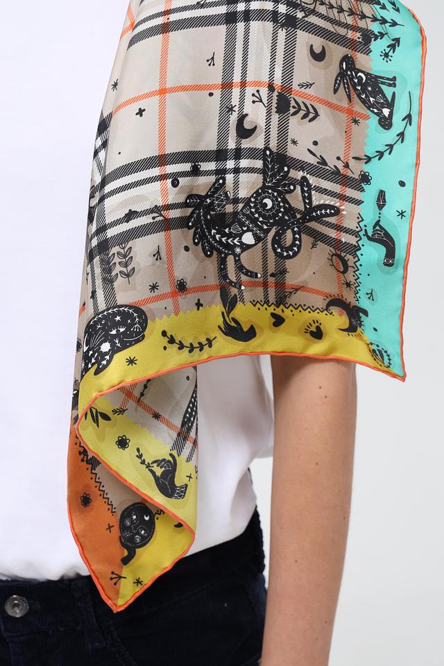 Платок имеет квадратную форму и украшен оригинальным принтом, сочетающим в себе абстрактные мотивы, изображения животных и геометрические узоры. Цветовая гамма включает в себя оттенки жёлтого, оранжевого, бирюзового, чёрного и бежевого.