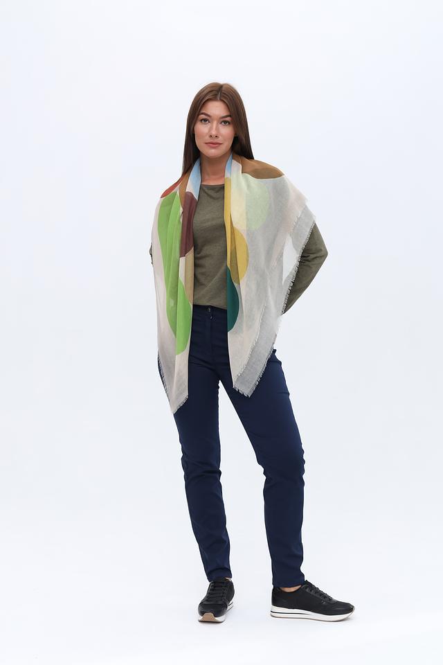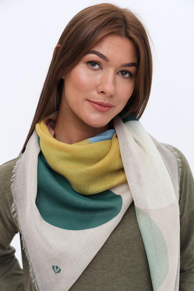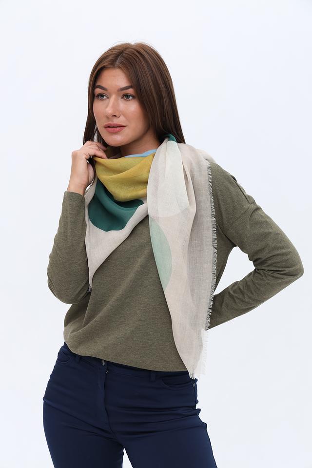 Дизайн платка выполнен в виде абстрактного геометрического принта, сочетающего в себе оттенки зелёного, жёлтого, голубого и бежевого. Такое сочетание цветов делает его универсальным дополнением к различным стилям одежды.