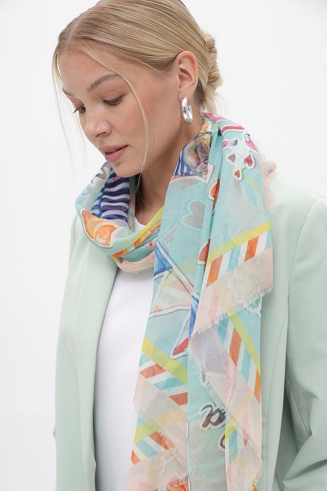 Платок имеет прямоугольную форму и украшен оригинальным принтом, выполненным в голубых, оранжевых, зелёных и розовых тонах. Бахрома по краям добавляет аксессуару изысканности.