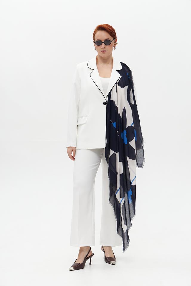 Платок бренда Oui, выполненный в бело-сине-тёмно-синей цветовой гамме, украшен абстрактным цветочным принтом. Изделие из 100% вискозы отличается мягкостью и приятными тактильными ощущениями. Состав: вискоза 100%