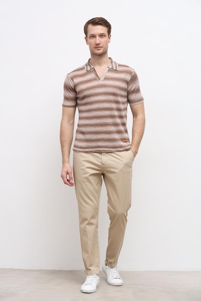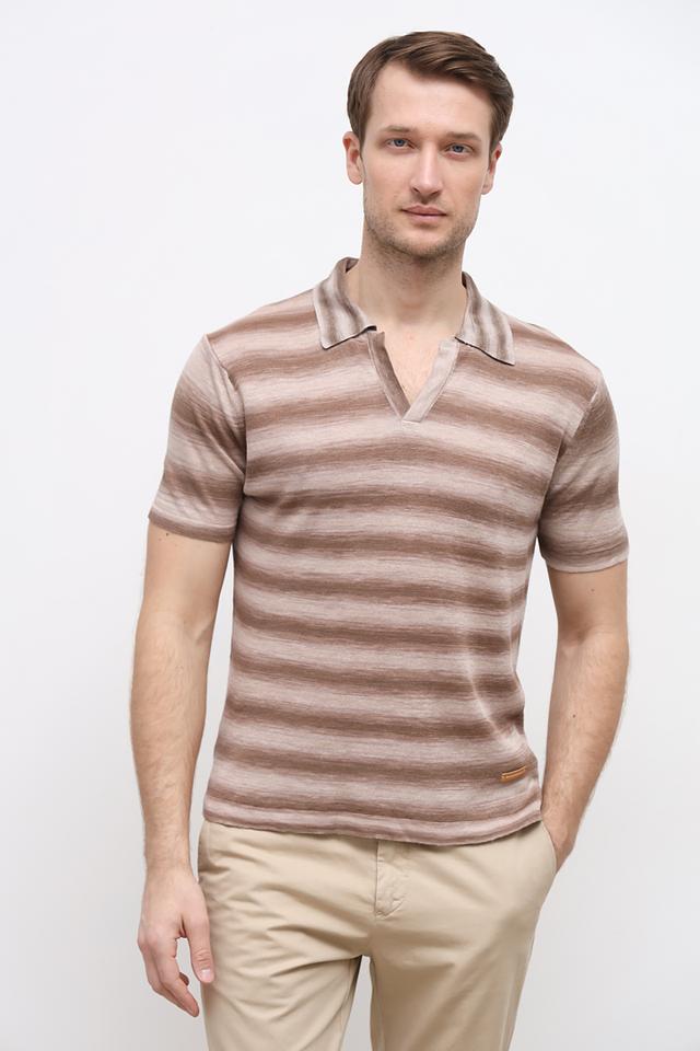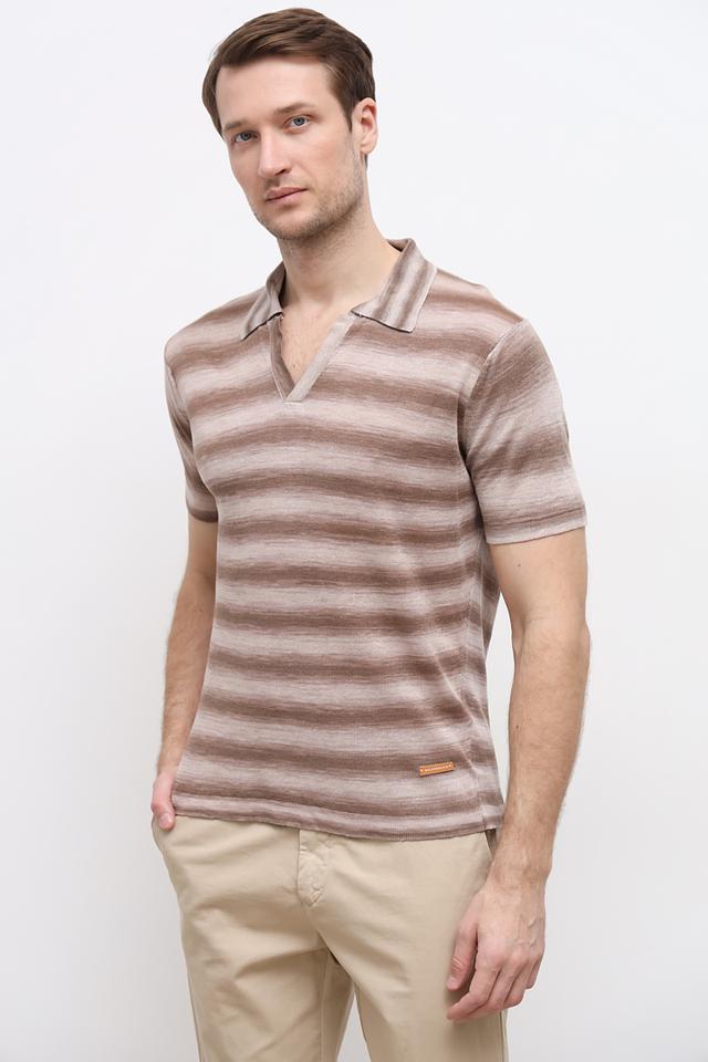 Поло выполнено в бежевом цвете с выразительным полосатым рисунком, который придает образу динамичность и стиль. Воротник выполнен в классической форме. На левой стороне груди расположена небольшая металлическая планка с логотипом бренда.