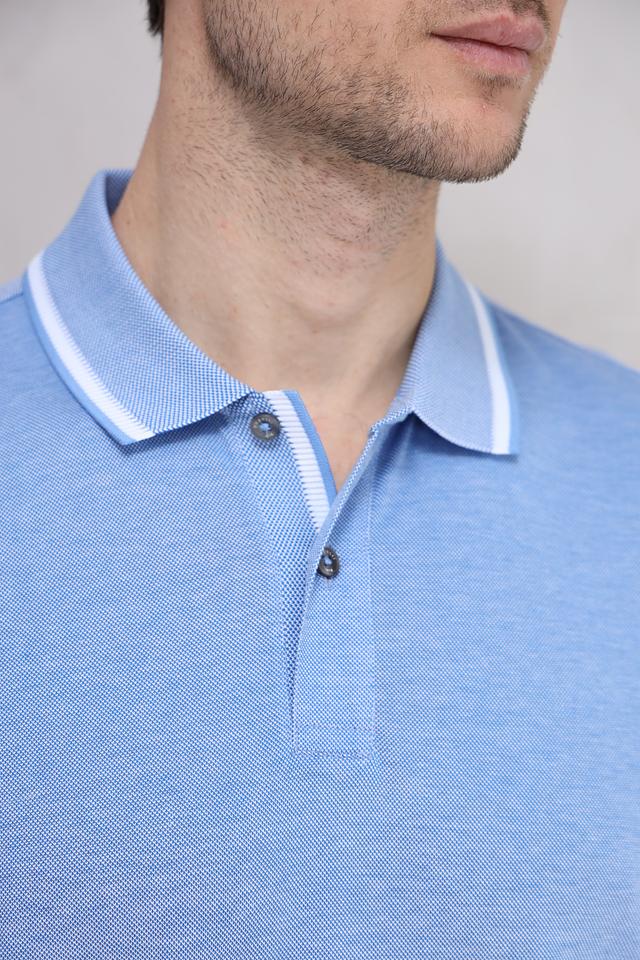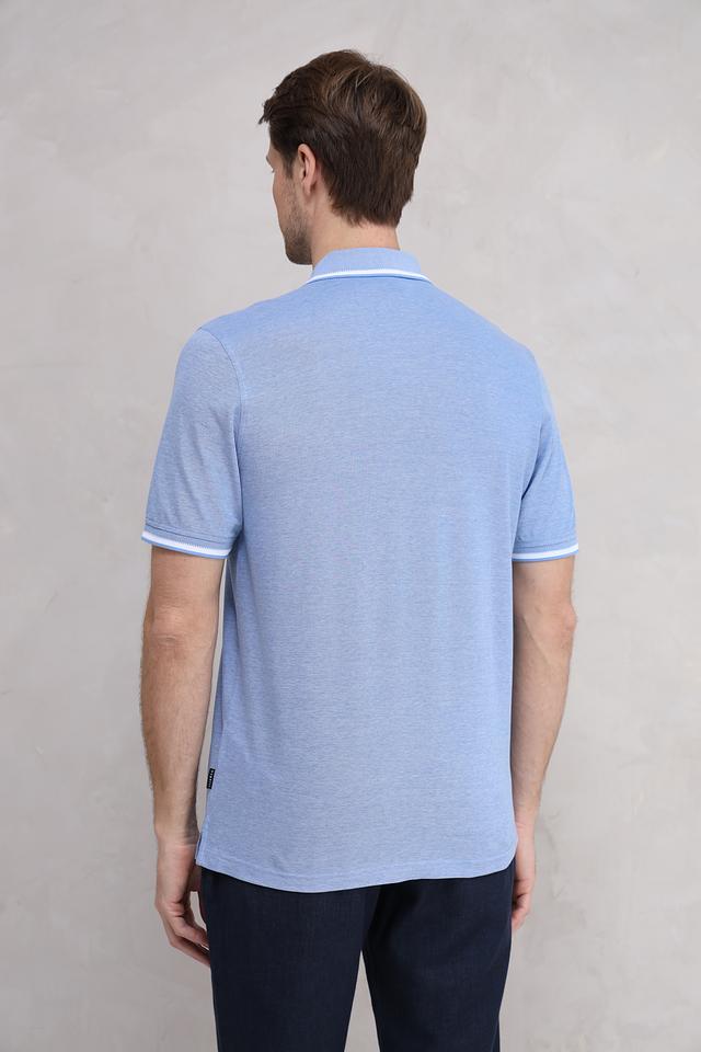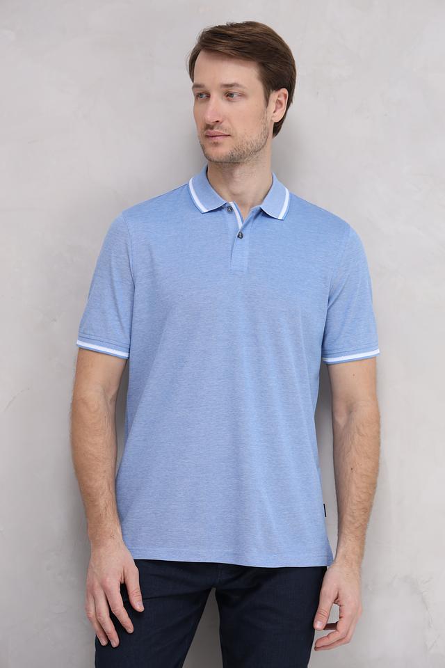 Мужское поло Bugatti голубого цвета с белой отделкой на воротнике и рукавах. Изготовлено из 100% хлопка, обеспечивающего комфорт и воздухопроницаемость. Стильный и универсальный вариант для повседневного образа. Состав: хлопок 100%