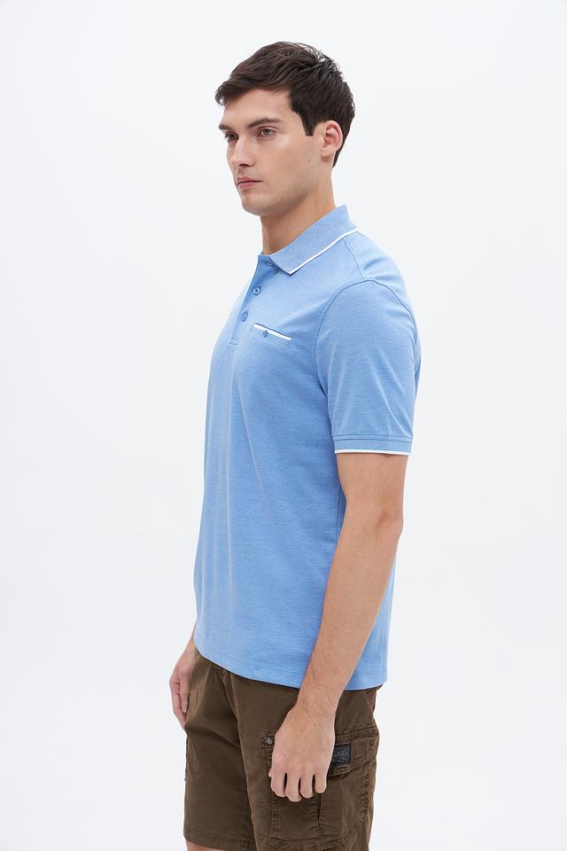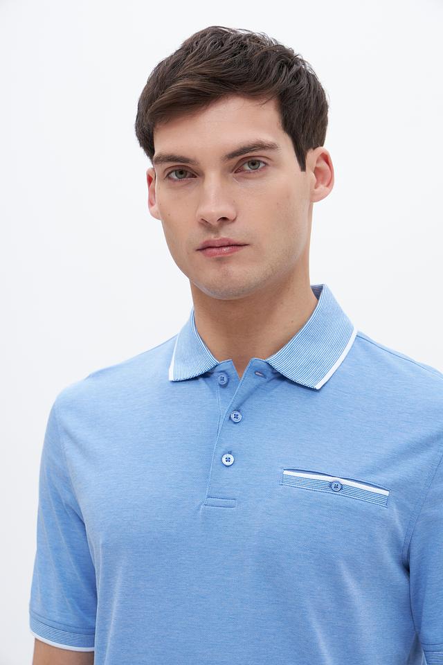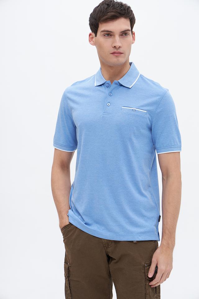 Мужское поло Bugatti голубого цвета с коротким рукавом и белой отделкой на воротнике и рукавах. Изготовлено из сочетания хлопка и полиэстера, обеспечивающего комфорт и практичность. Состав: полиэстер 50%, хлопок 50%
