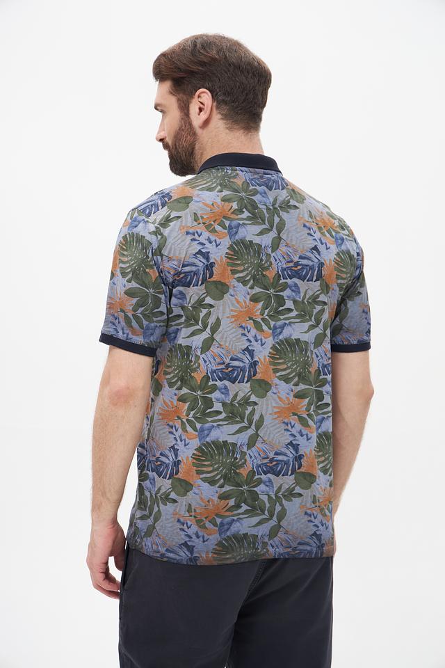 Основной цвет поло – серый, который служит идеальным фоном для красочного тропического принта. Принт выполнен в виде изображения экзотических листьев и цветов, выполненных в оттенках зеленого, оранжевого, синего и коричневого.