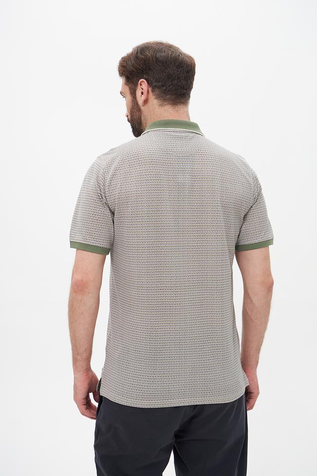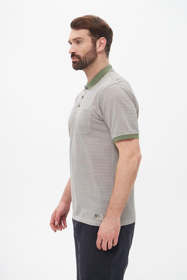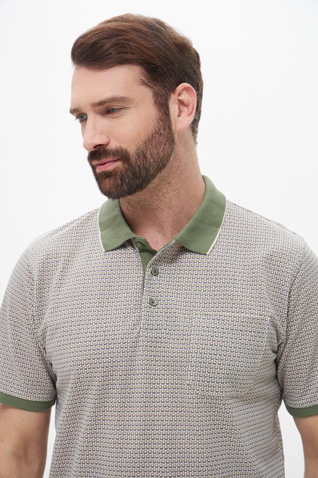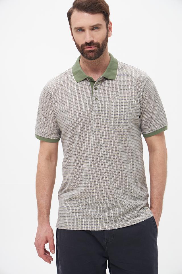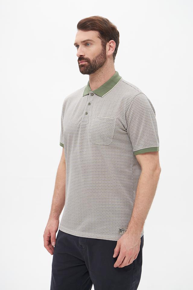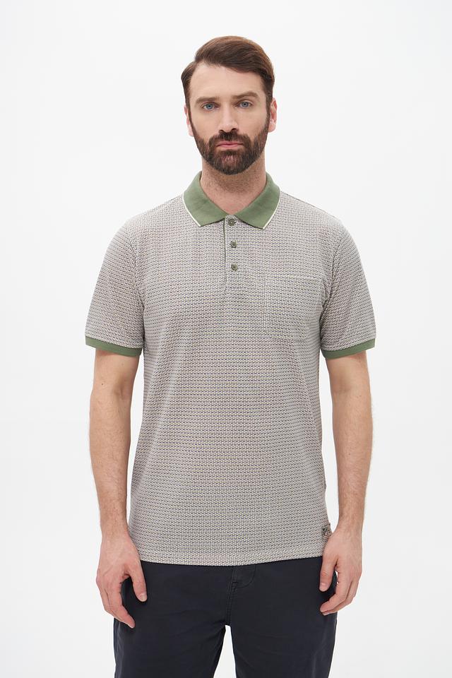 Мужское поло Casa Moda серого цвета с оригинальным геометрическим узором и зелёной отделкой воротника и рукавов. Изготовлено из сочетания хлопка и полиэстера, обеспечивающего комфорт и практичность. Состав: полиэстер 50%, хлопок 50%