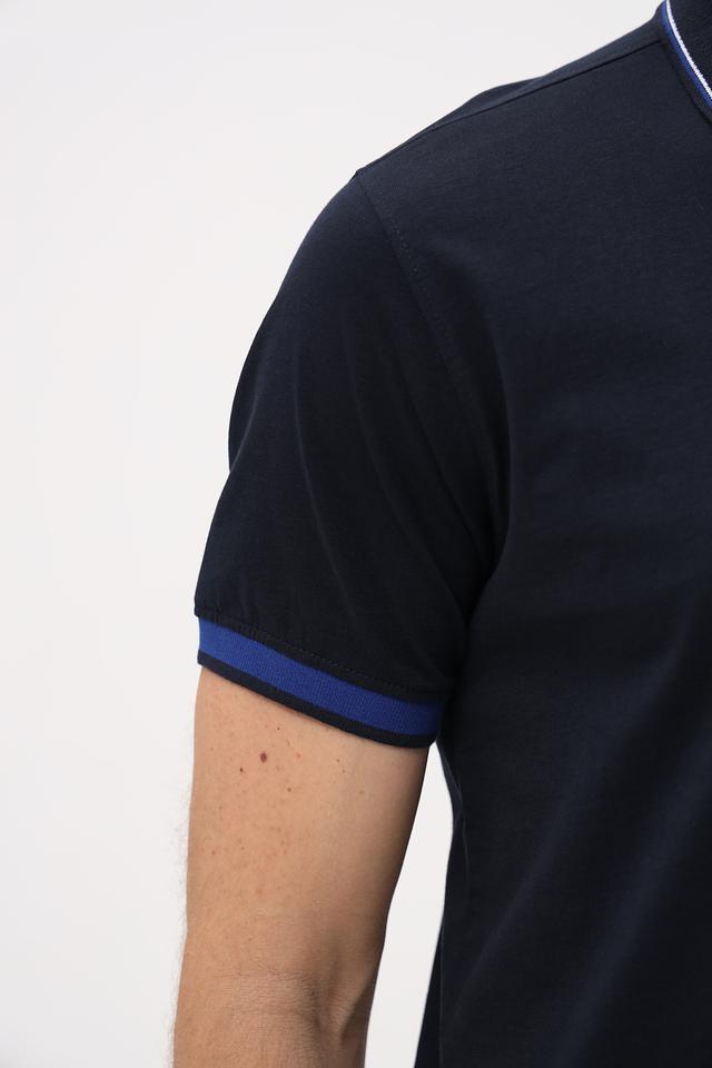 Модель имеет классический крой, короткие рукава и воротник поло с застёжкой на пуговицы. Отличительной особенностью является контрастная отделка воротника и рукавов синего цвета, а также вышитый логотип бренда на груди. Такой дизайн делает поло универсальным вариантом для повседневной носки и создания стильных образов.