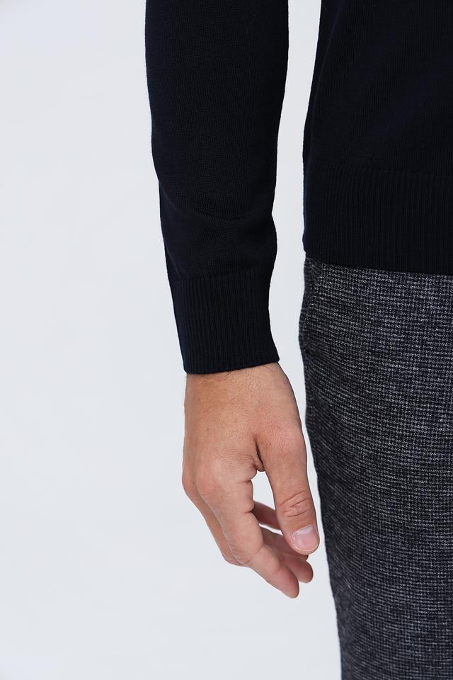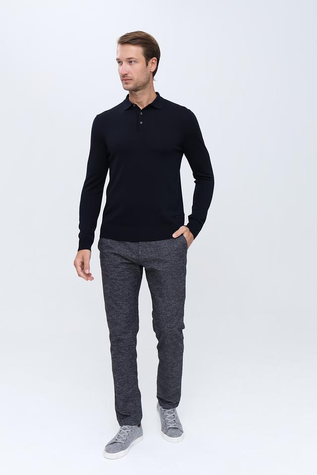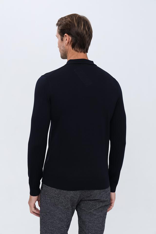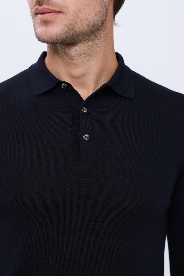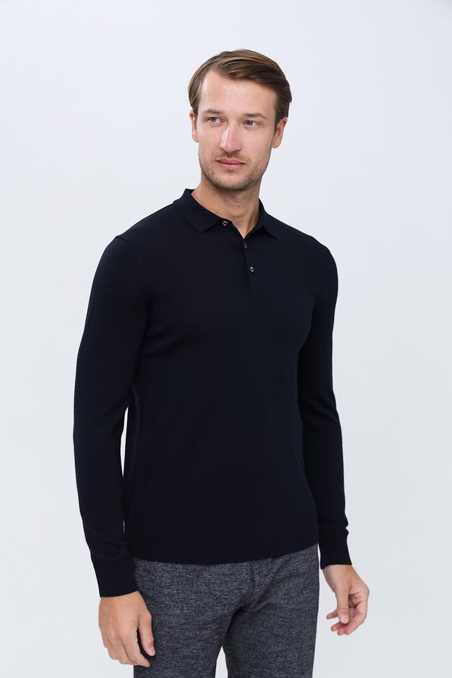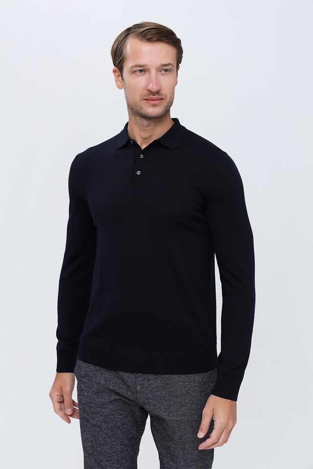 Поло имеет классический крой с длинными рукавами, что делает его подходящим как для повседневной носки, так и для более формальных мероприятий. Тёмно-синий цвет придает изделию благородный и сдержанный вид, легко сочетаясь с другими элементами одежды.