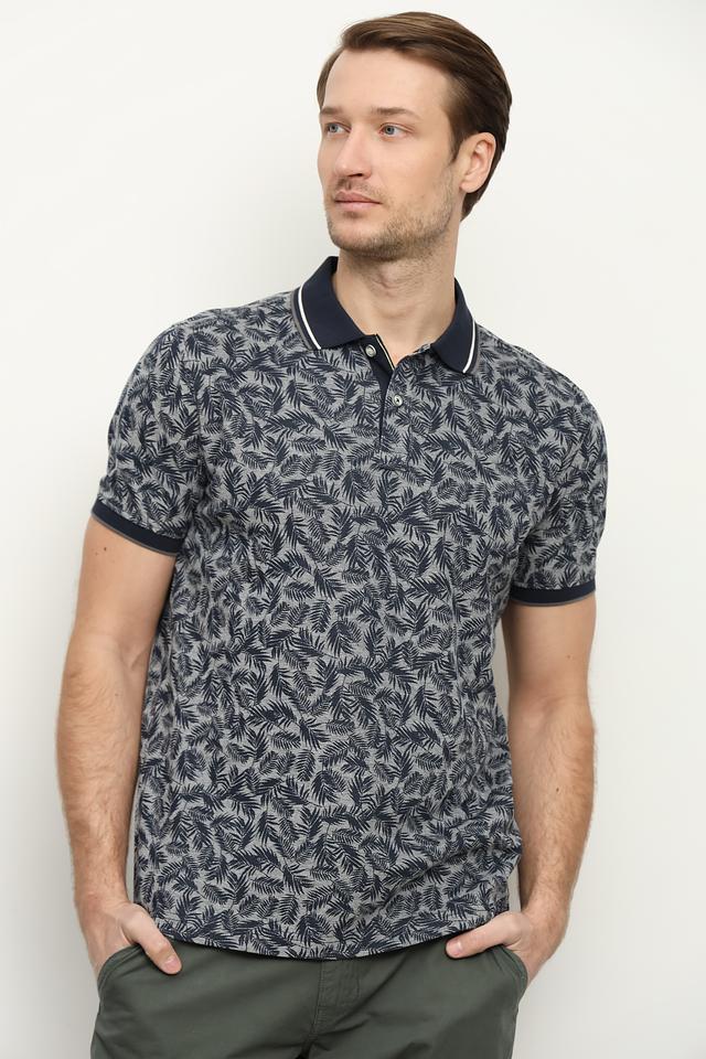 Поло имеет классический крой и короткие рукава. Отличительной особенностью является стильный принт с растительным орнаментом в синих и серых тонах, который придаёт изделию индивидуальность.