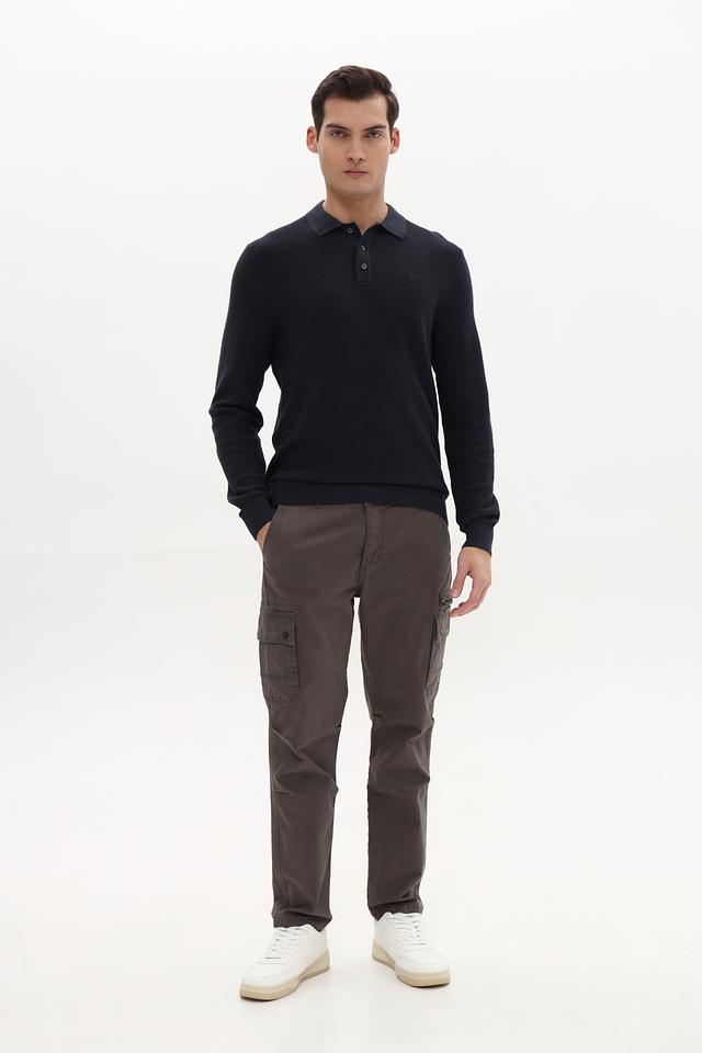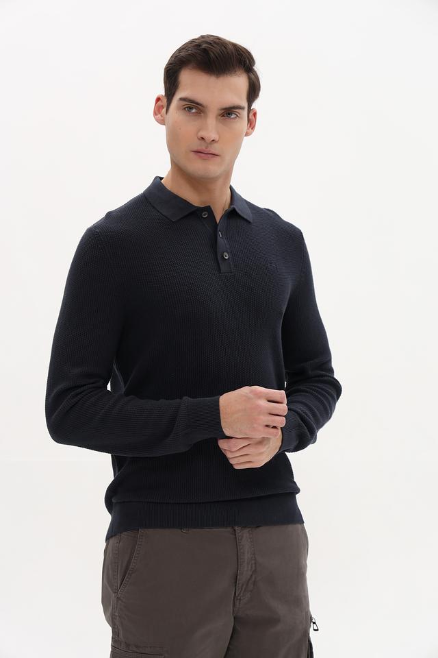 Поло имеет классический крой с длинными рукавами, что делает его отличным выбором для прохладной погоды. Воротник-поло с тремя пуговицами добавляет образу элегантности и сдержанности. Текстура ткани – мелкий трикотаж, что придает изделию особый шарм и тактильно приятные ощущения.
