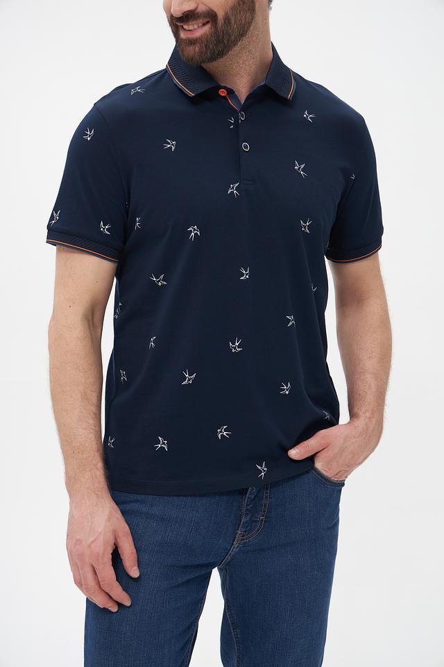 Мужское поло Monte Carlo тёмно-синего цвета с оригинальным принтом в виде птиц. Изготовлено из 100% хлопка, обеспечивающего комфорт и воздухопроницаемость. Стильный и удобный выбор для повседневной носки. Состав: хлопок 100%