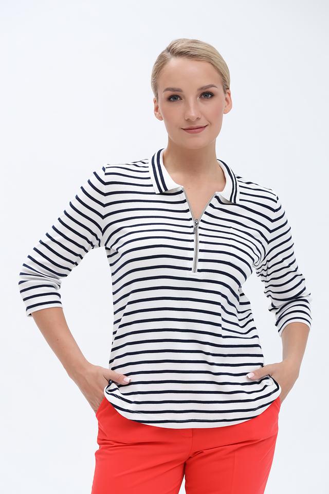 Женское поло от Olsen выполнено в классическую бело-синюю полоску. Модель с рукавом 3/4 и застежкой-молнией имеет удобный крой и изготовлено из 100% хлопка. Состав: хлопок 100%