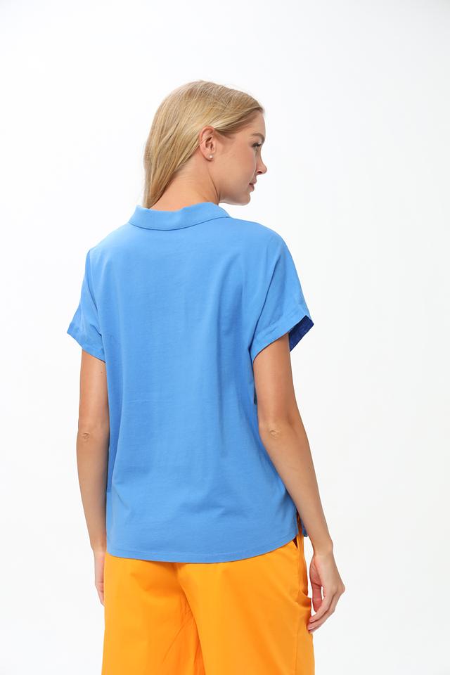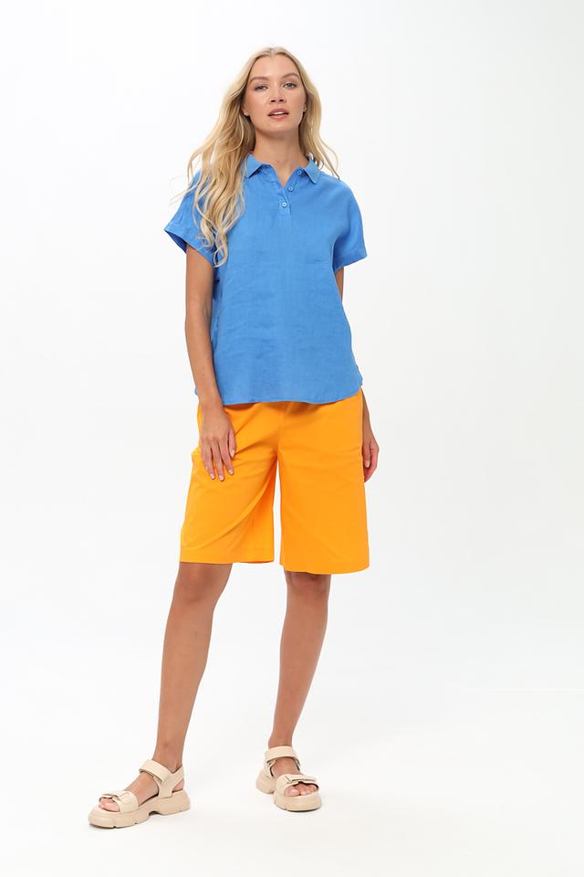 Это женское поло от бренда Oui, выполненное из высококачественного льна. Преобладающий цвет – голубой, который придает изделию свежесть и лёгкость.