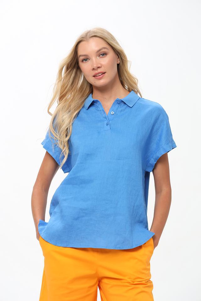 Поло имеет прямой крой, короткий рукав и классический воротник-поло с застёжкой на пуговицы. Текстура льна обеспечивает комфорт и воздухопроницаемость, что делает эту модель идеальной для тёплой погоды.