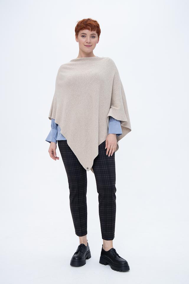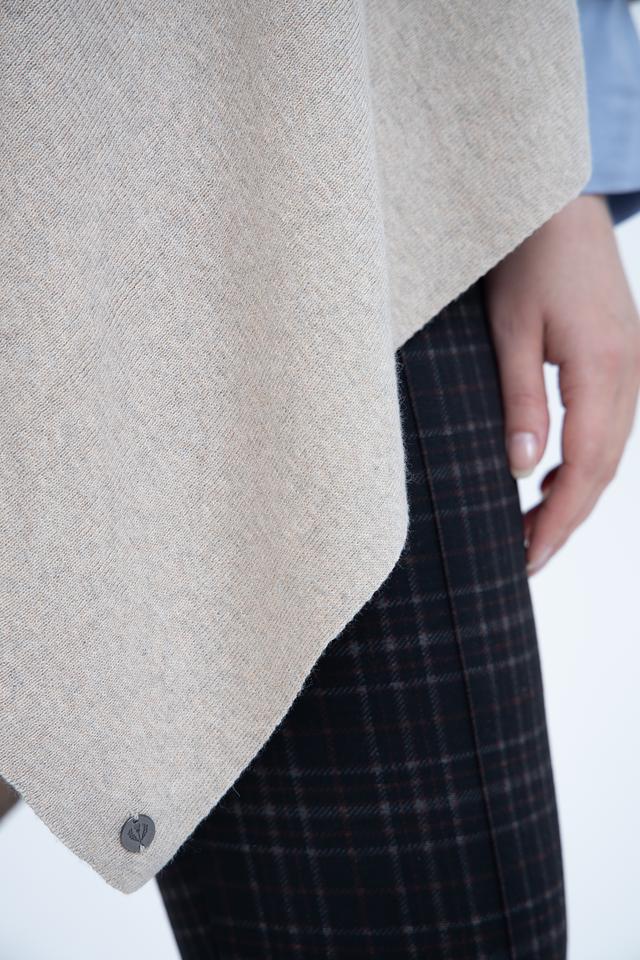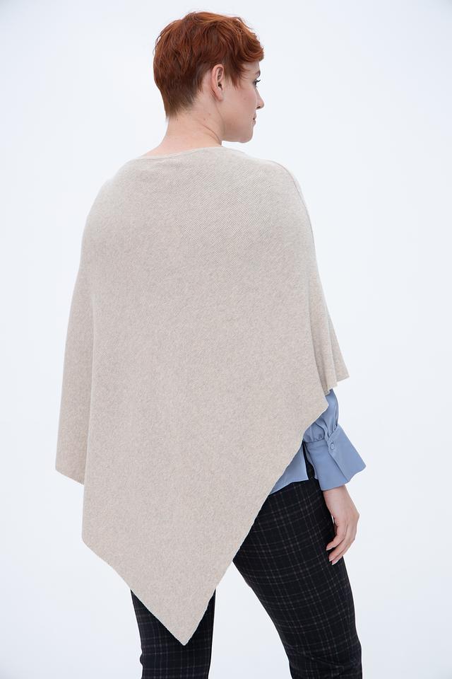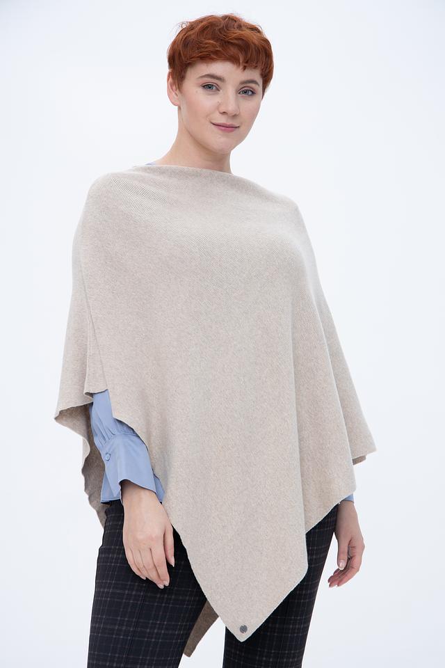 Пончо имеет свободный крой и асимметричный дизайн, что придает ему современный и стильный вид. Бежевый цвет делает его универсальным и легко сочетаемым с различными элементами одежды.