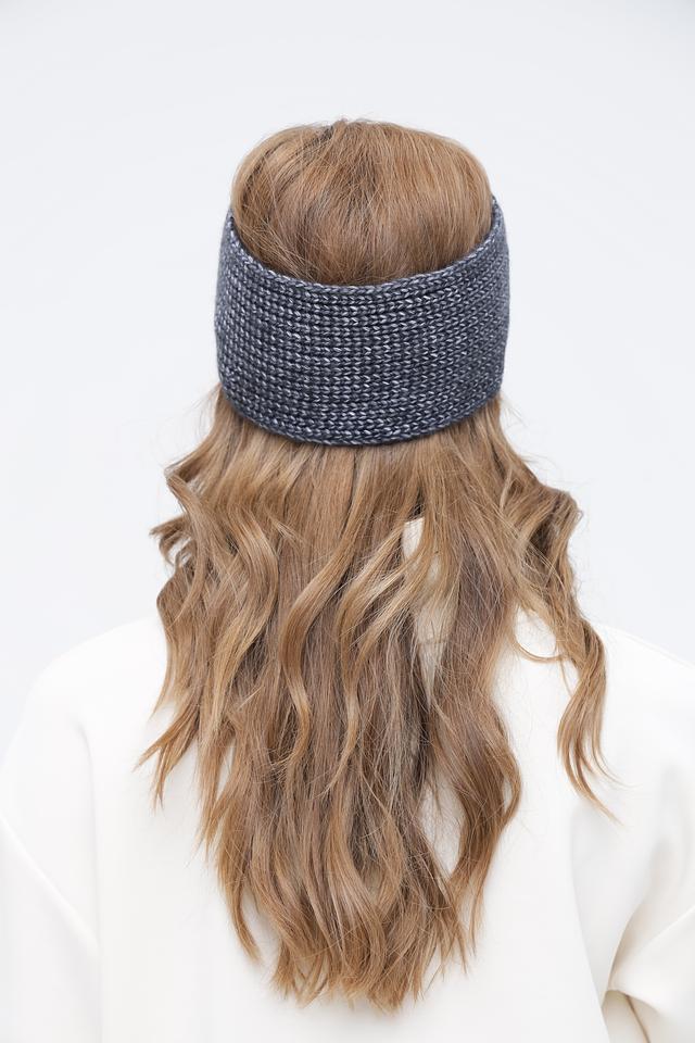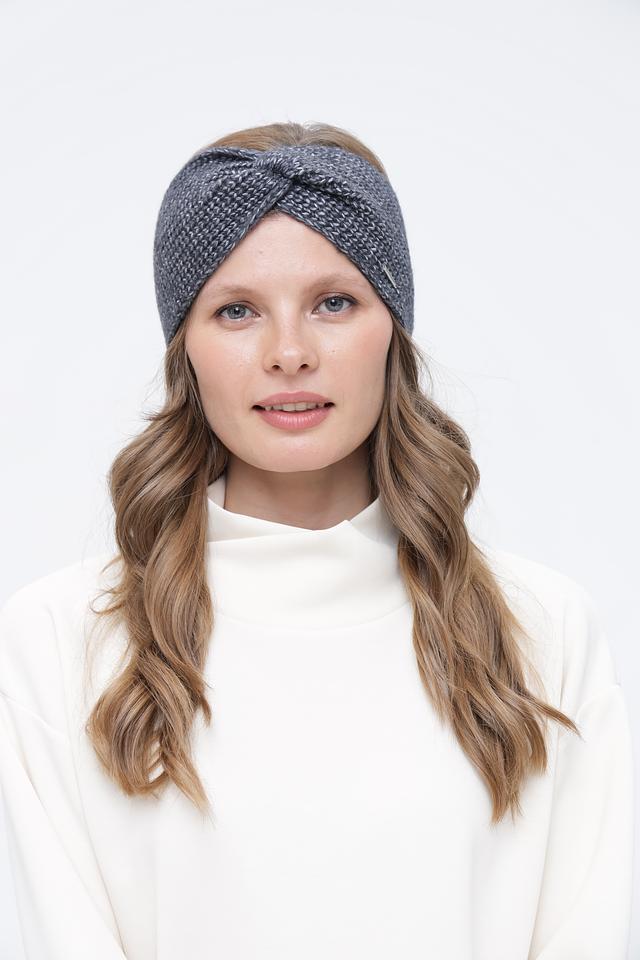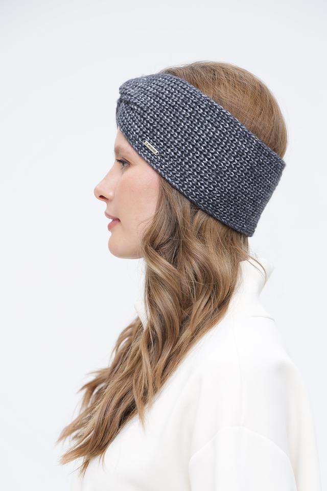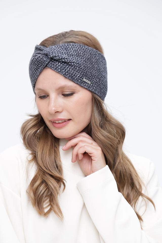 Повязка имеет вязаную текстуру и стильный дизайн с перекрученным элементом. Цвет – серый с меланжевым эффектом. Небольшой логотип бренда Wegener аккуратно размещен сбоку.