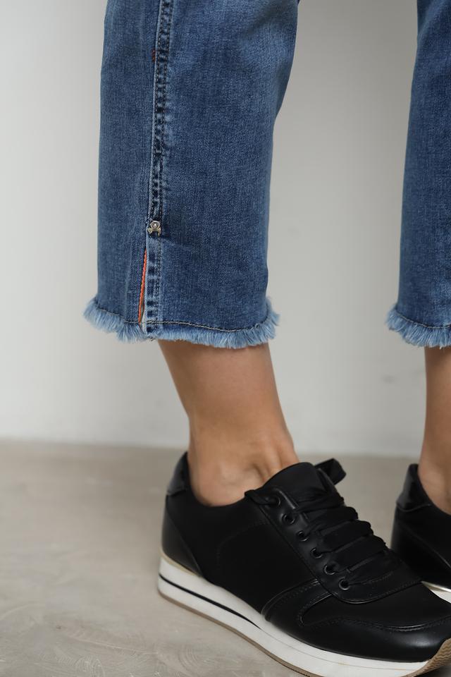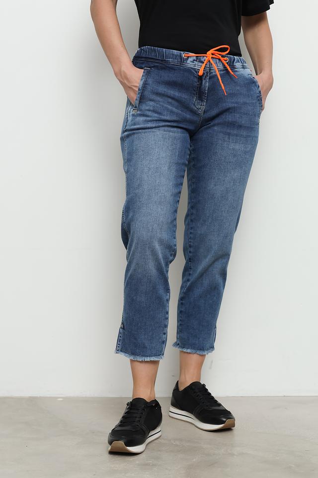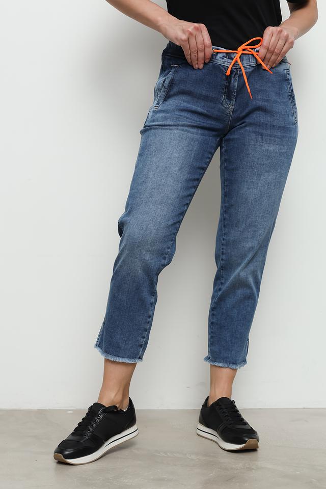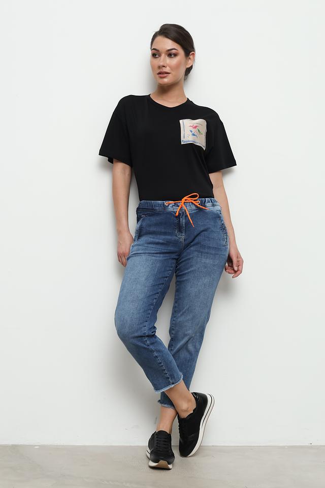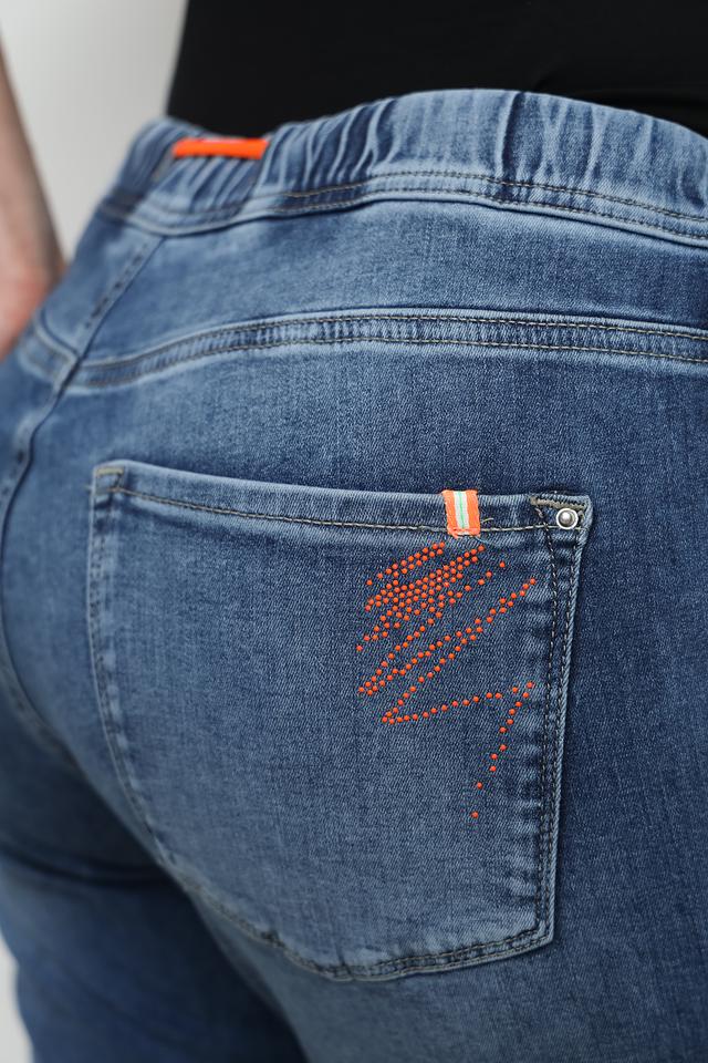 Джинсы имеют слегка зауженный крой и укороченную длину, что придает им современный вид. Декоративные потертости и эффект "варки" добавляют образу непринужденности. На заднем кармане расположена оригинальная вышивка оранжевого цвета, которая подчеркивает индивидуальность модели.