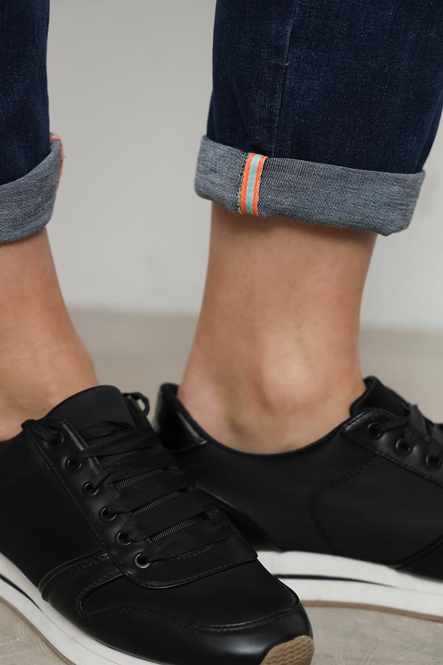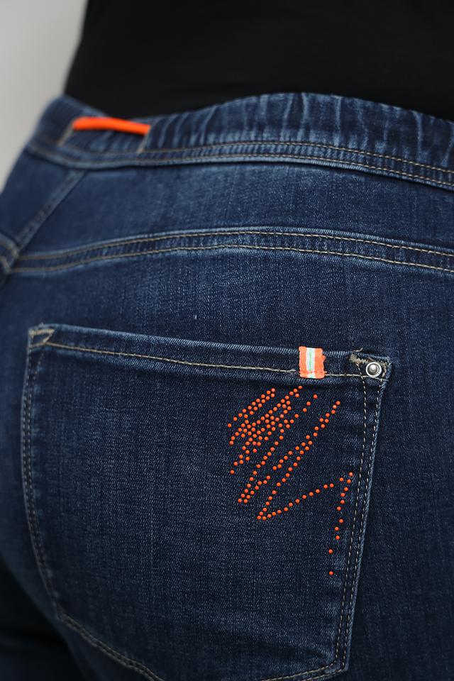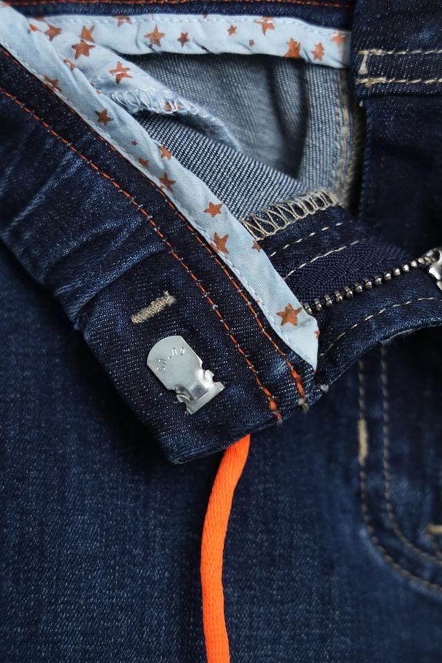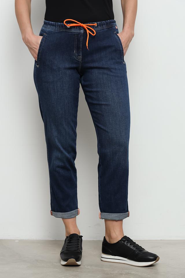 Джинсы имеют удобную посадку благодаря эластичному поясу с ярким оранжевым шнурком, который добавляет образу оригинальности. Крой брюк – слегка зауженный к низу, с возможностью подворота, что позволяет создавать разные стили. Ткань состоит из 98% хлопка и 2% эластана, обеспечивая мягкость, воздухопроницаемость и небольшую степень эластичности.