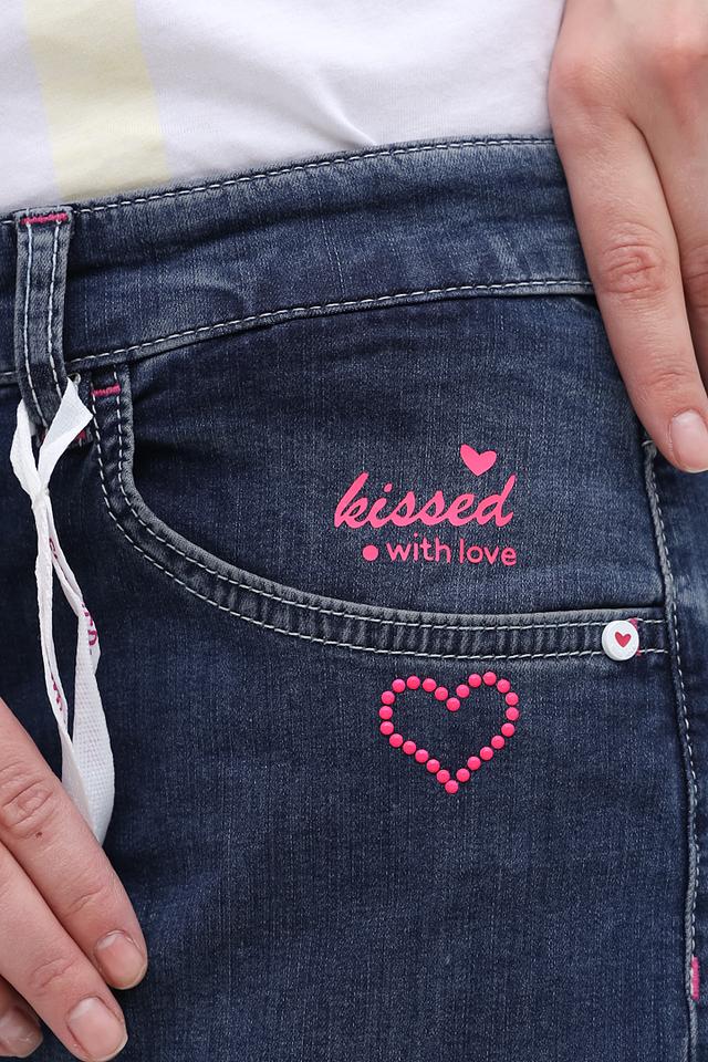 Джинсы имеют завышенную талию, что визуально удлиняет ноги и подчеркивает талию. Декоративные элементы, такие как вышивка "kissed with love" и небольшие розовые ленты, добавляют образу игривости и оригинальности.