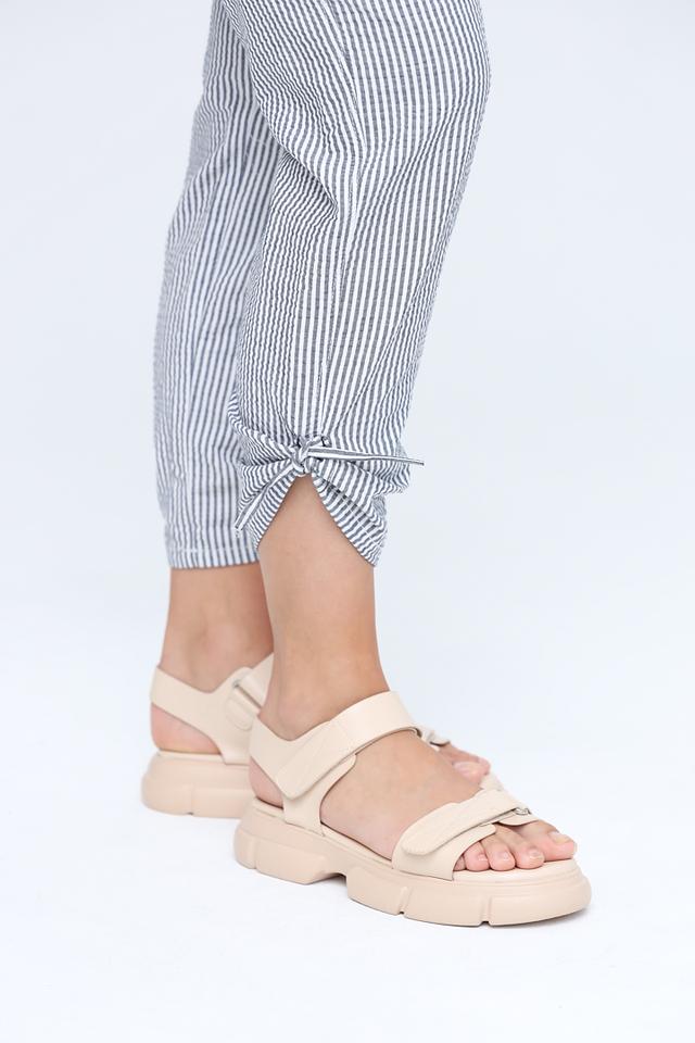 Брюки имеют зауженный к низу силуэт, который визуально удлиняет ноги и создает элегантный образ. Пояс на резинке обеспечивает удобную посадку и свободу движений. Наличие боковых карманов добавляет функциональности.