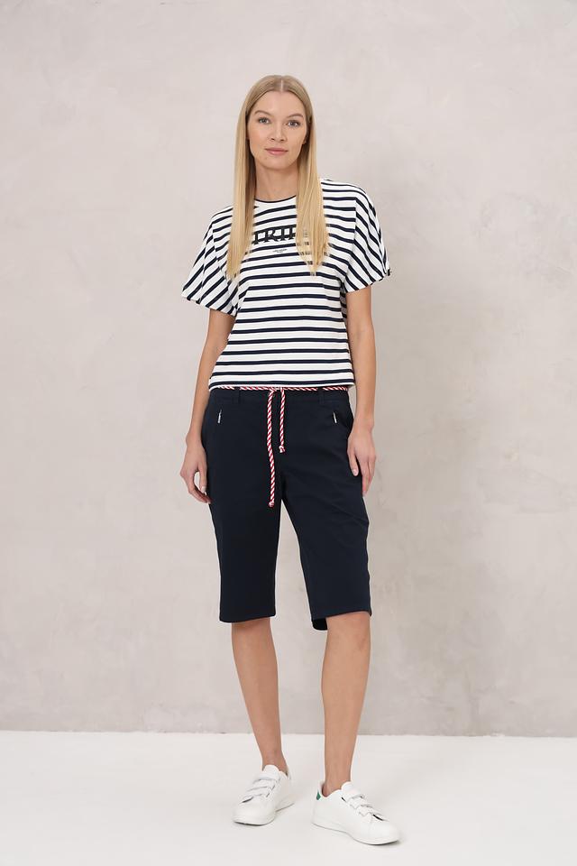 Шорты имеют удобную посадку и эластичный пояс с контрастным шнурком в красно-белую полоску, который позволяет регулировать облегание. Модель дополнена боковыми карманами для мелочей.