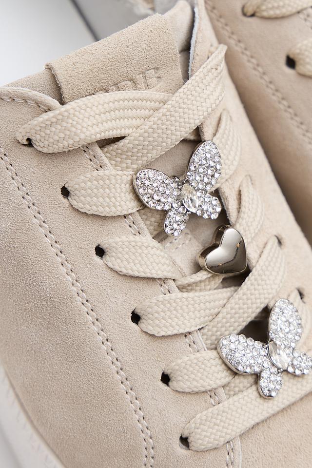 Верх кроссовок изготовлен из высококачественной натуральной кожи, что обеспечивает комфорт и долговечность. Платформа добавляет обуви современный вид и обеспечивает дополнительный комфорт при ходьбе. Декоративные элементы в виде бабочек, украшенные стразами, придают сникерсам изысканность и индивидуальность.